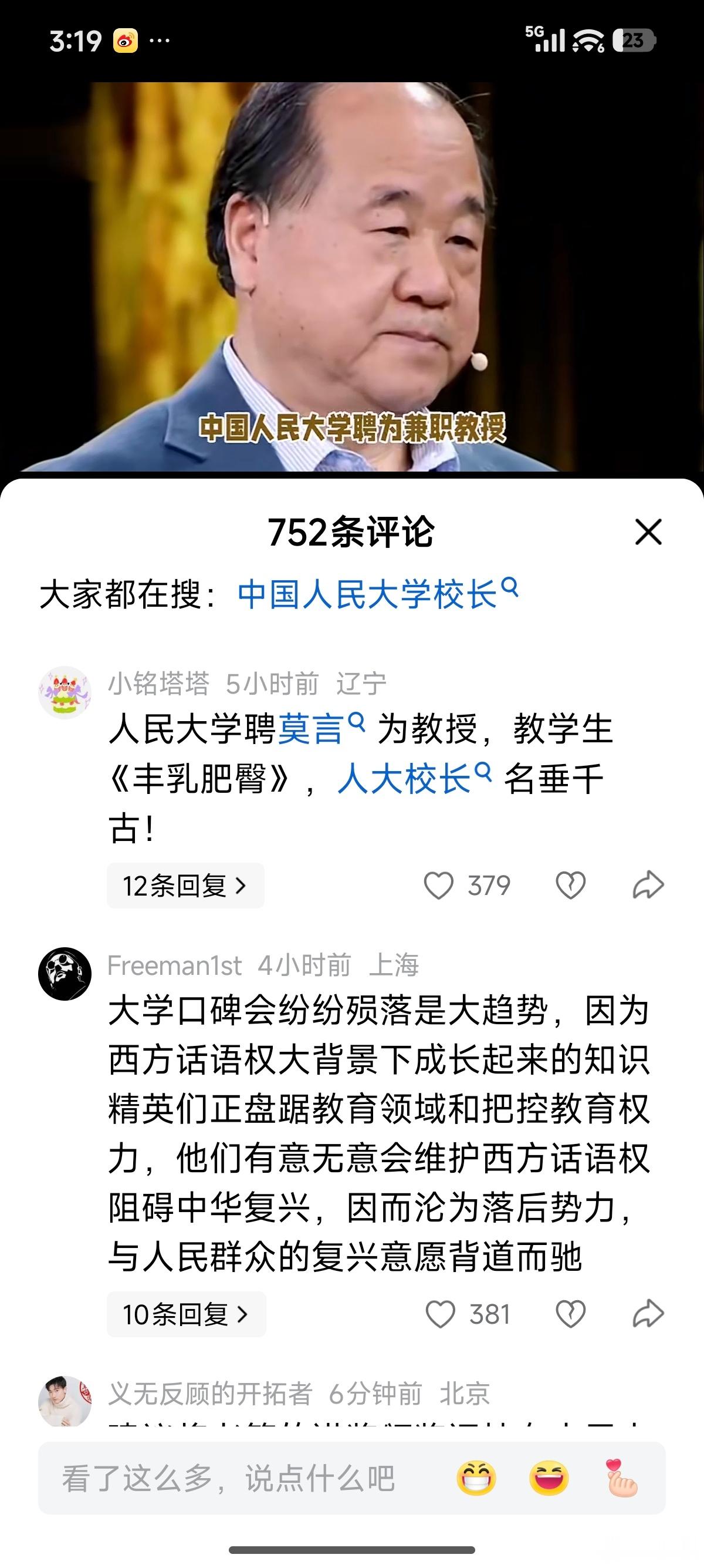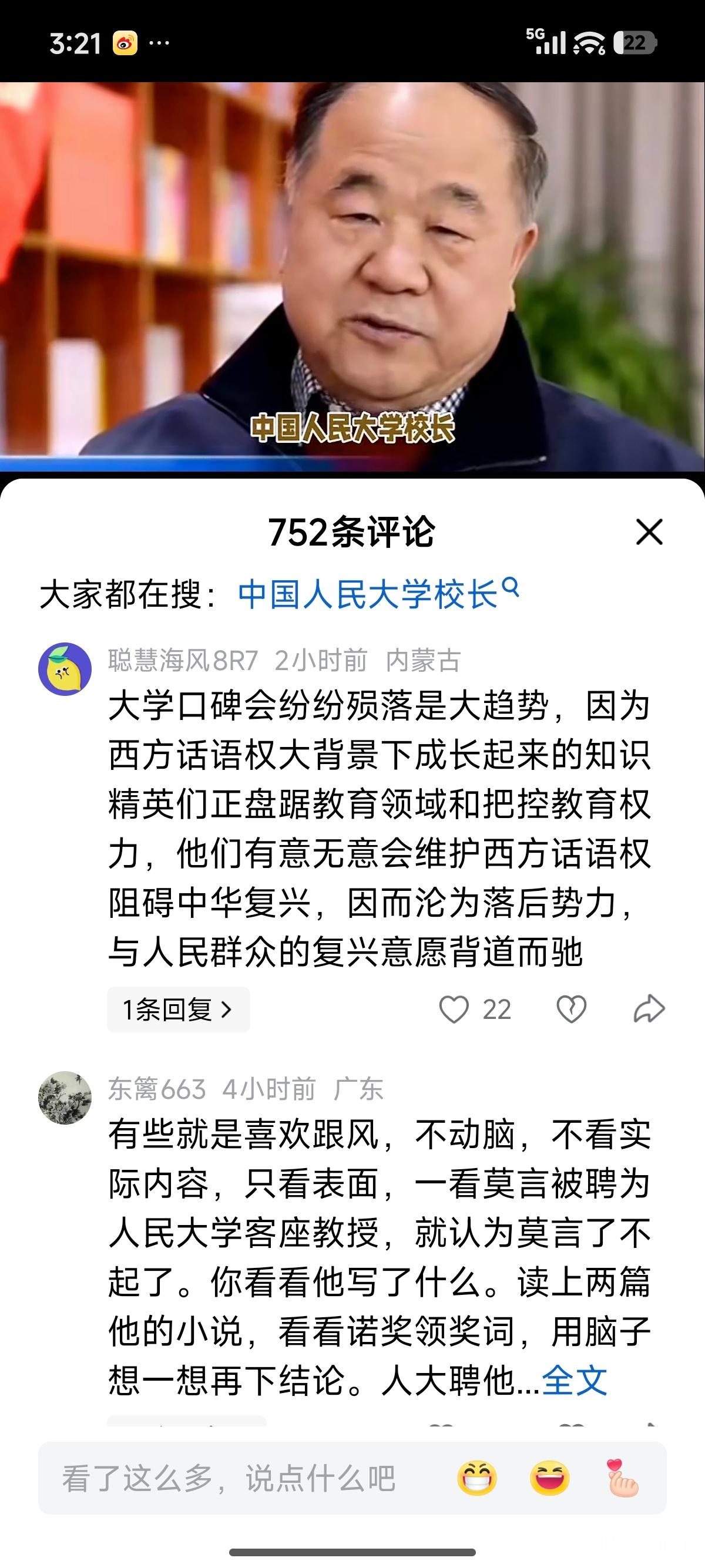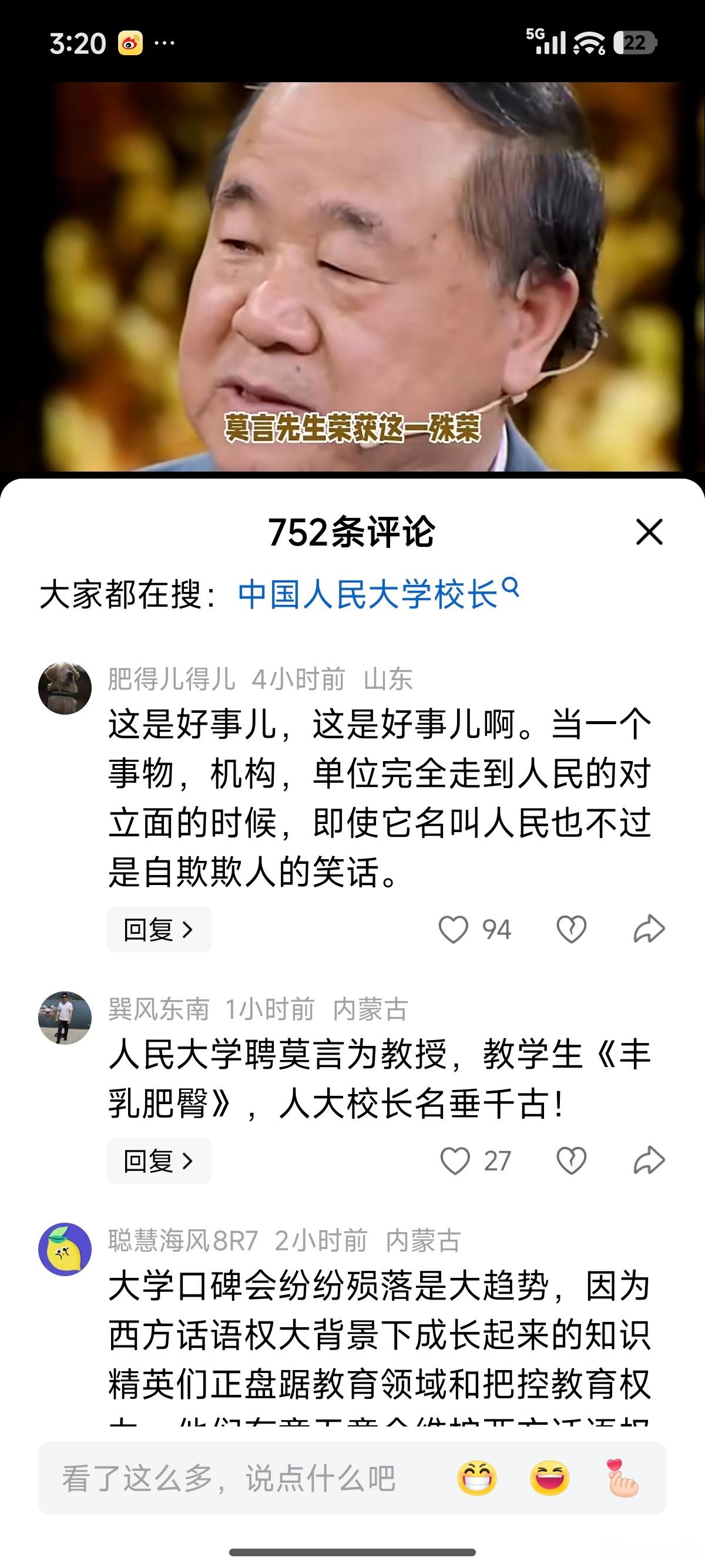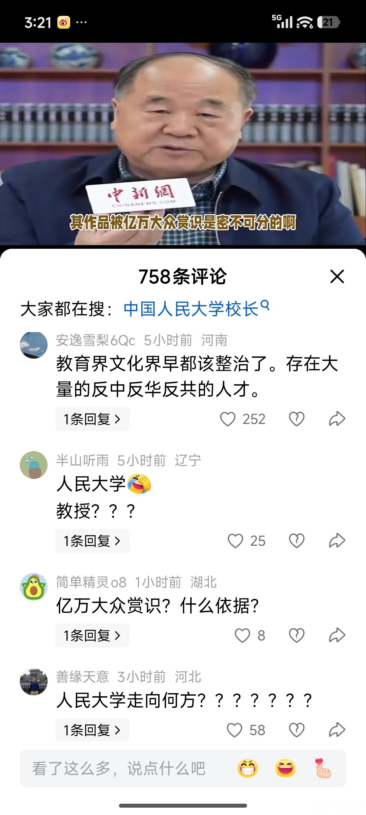 莫言 中国人民大学聘请莫言为该校兼职教授,看看下面的留言(顺着截屏不做任何选择)怎么几乎一片叫骂声?