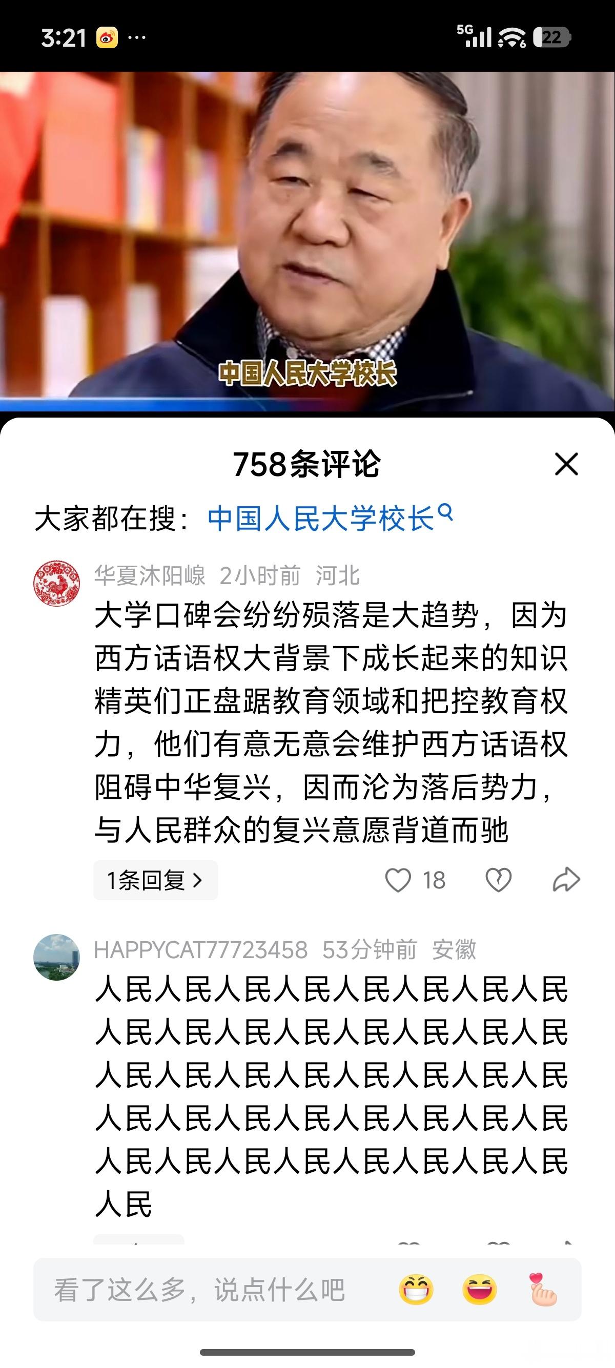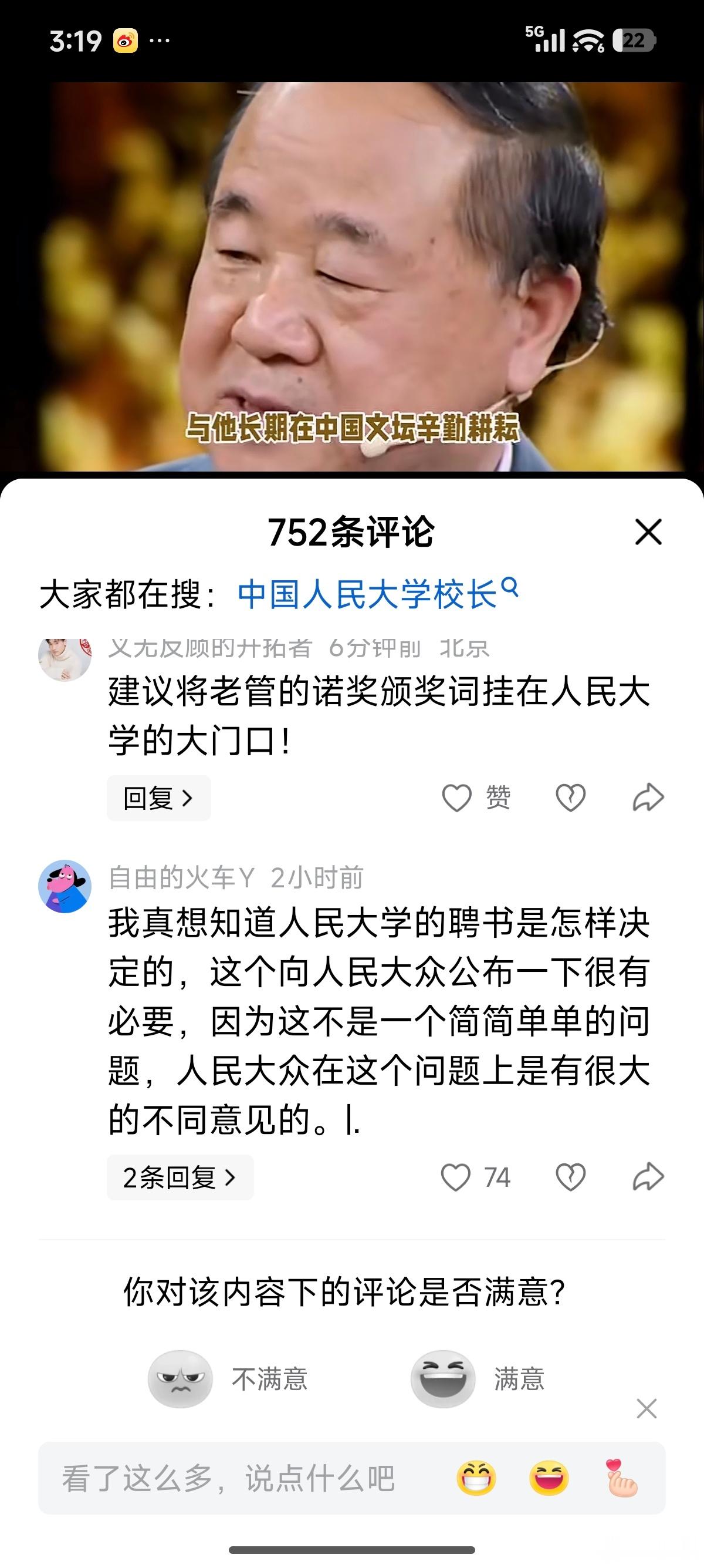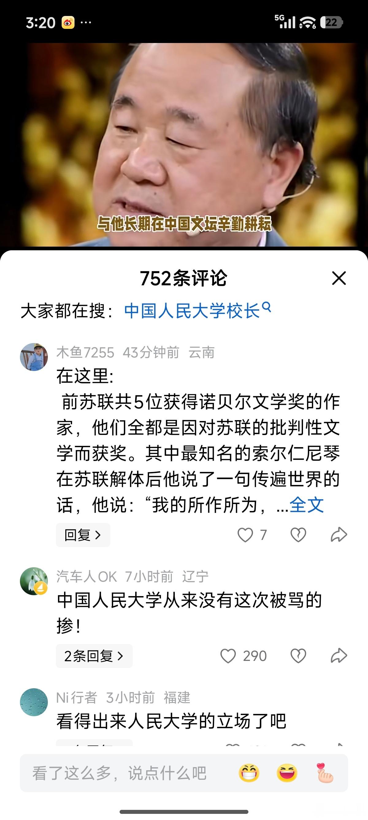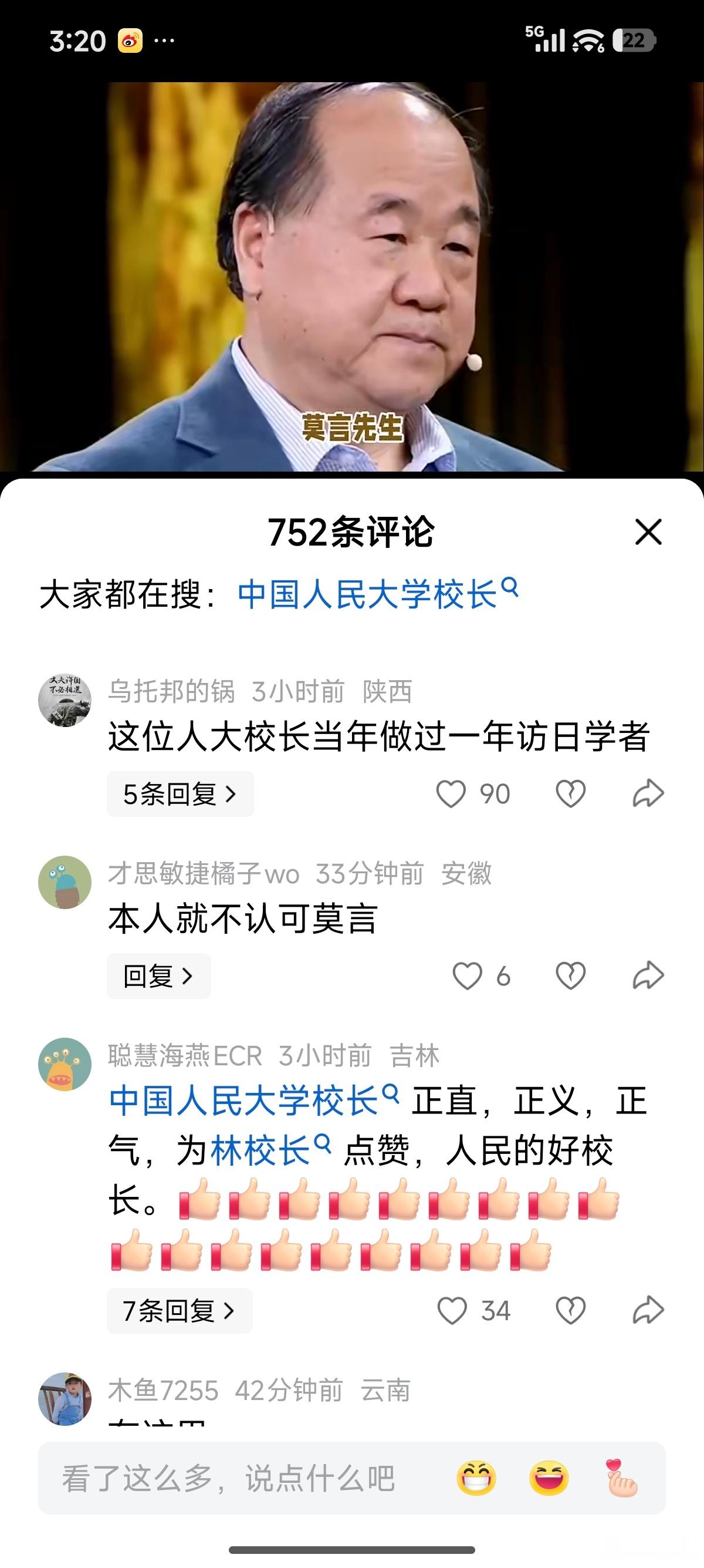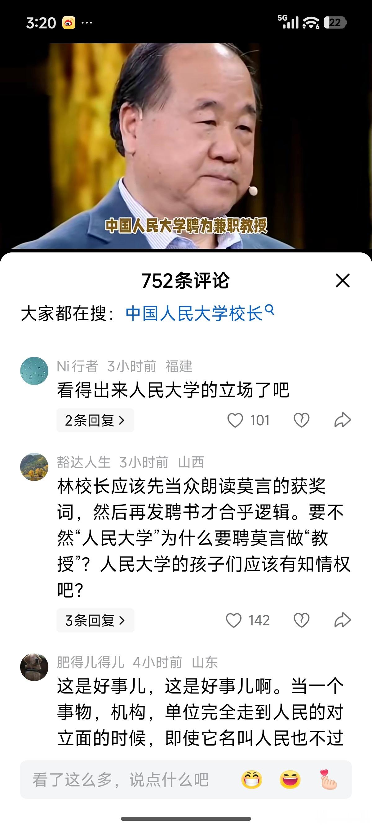 莫言 中国人民大学聘请莫言为该校兼职教授,看看下面的留言(顺着截屏不做任何选择)怎么几乎一片叫骂声?
