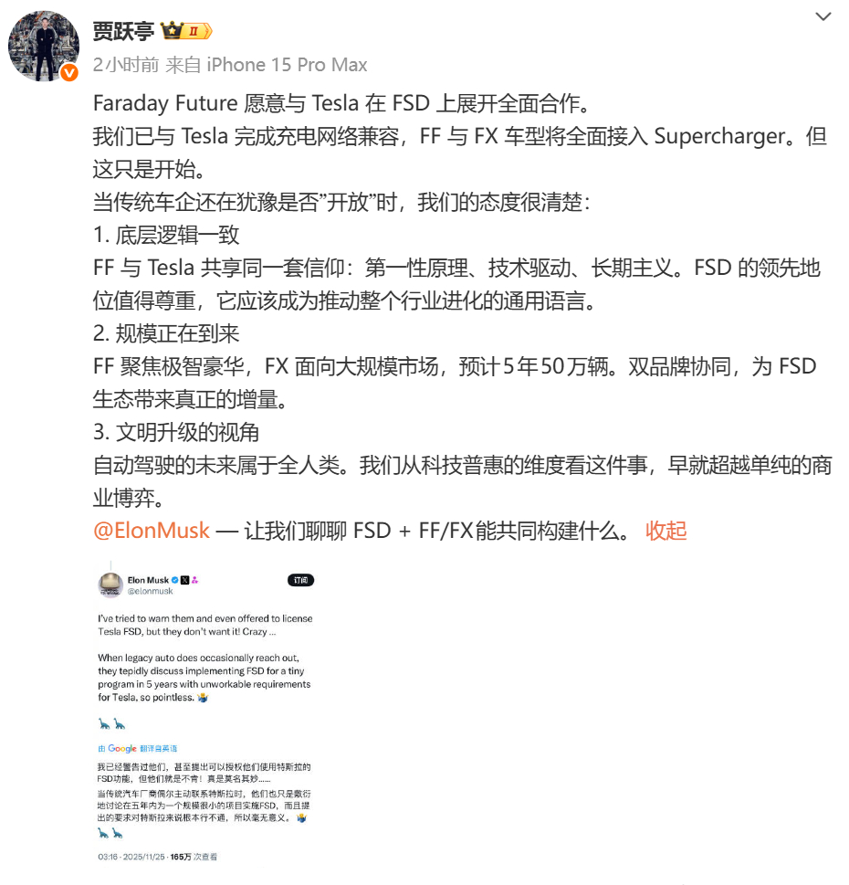 贾老板主动向马斯克抛橄榄枝,让 FF 的车上 FSD。这个组合放在国内还挺搭配的,期货 + 期货。汽车黑科技