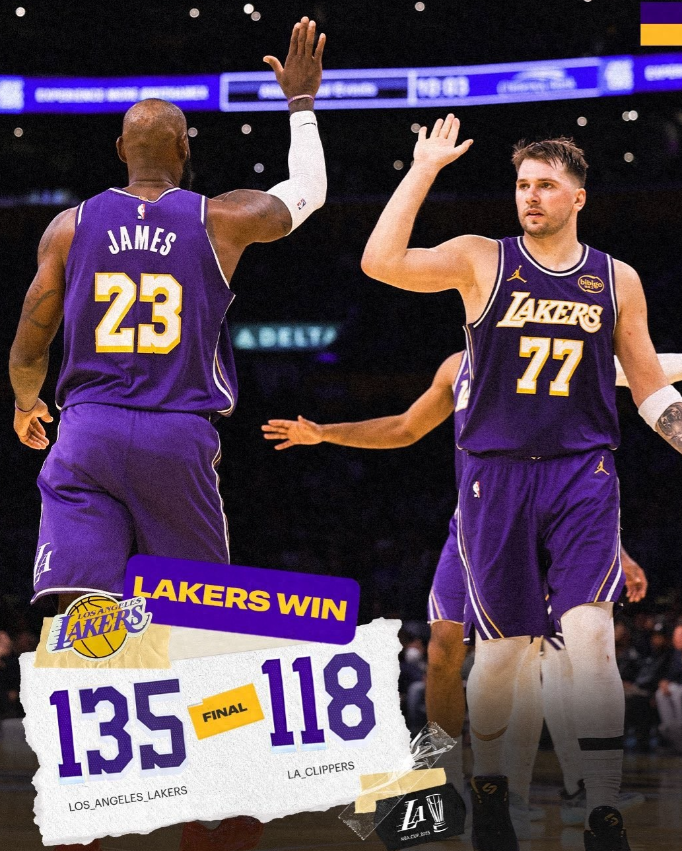 在NBA杯的比赛中,洛杉矶湖人队在主场135-118击败了同城对手洛杉矶快船队,取得了杯赛小组赛三连胜。 在本场比赛前,湖人队在洛城德比中已经取得了三连胜,算上本场比赛,湖人队已经连续四场笑傲德比战。 此役过后,湖人队在杯赛中3胜0负出线,快船队2胜1负排名第二,同时湖人队以13胜4负排名西部第二,快船则以5胜13负跌至西部第13位。两队下一次进行德比战将会在北京时间12月21日,届时将在快船队主场Intuit Dome进行。