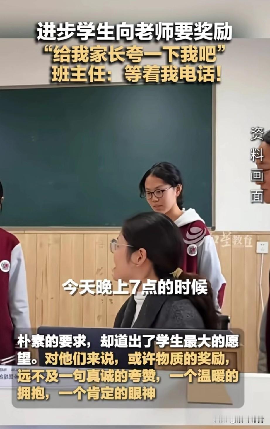 近日,成都某中学老师给进步学生送福利,女生表示给我家长夸一下我吧, 没想到老师直接答应了, 让她晚上7点准时打电话, 朴素的要求却道出了学生的愿望, 对他们来说, 或许物质的奖励, 远不如一句真诚的夸赞, 一个温暖的拥抱, 一个肯定的眼神, 他们都想得到父母的肯定, 老师这样的承诺者让周围的同学都羡慕不已! 学生的愿望都很简单, 就是希望老师当家长的面夸一夸他们, 这样的老师也值得尊重, 可以看出老师和他们的关系挺不错! 大家对于这样的老师怎么看? 教师夸奖学生 教师奖励 小学老师奖励 教师福利 进步学生颁奖