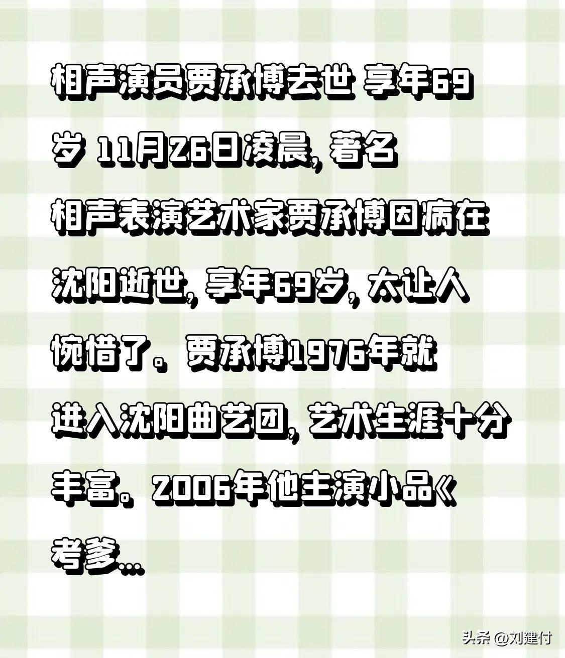 相声演员贾承博去世 享年69岁 相声演员贾承博去世,享年69岁 11月26日凌晨,著名相声表演艺术家贾承博因病在沈阳逝世,享年69岁,令人惋惜。 贾承博1976年进入沈阳曲艺团,艺术生涯丰富。2006年,他主演小品《考爹考妈》登上辽宁卫视春晚;同年,与常佩业合作的相声《团结一心拿大奖》获央视第三届相声大赛专业组一等奖。2007年,《推销》获第二届辽宁曲艺牡丹奖表演奖。他还参演多部影视作品,在《开心不调台》中饰演“贾六”为大众熟知,幽默表演令人印象深刻。“贾六”成经典,贾承博也永留观众心中。 相声界前辈逝世 相声大师去世 吴博君病逝
