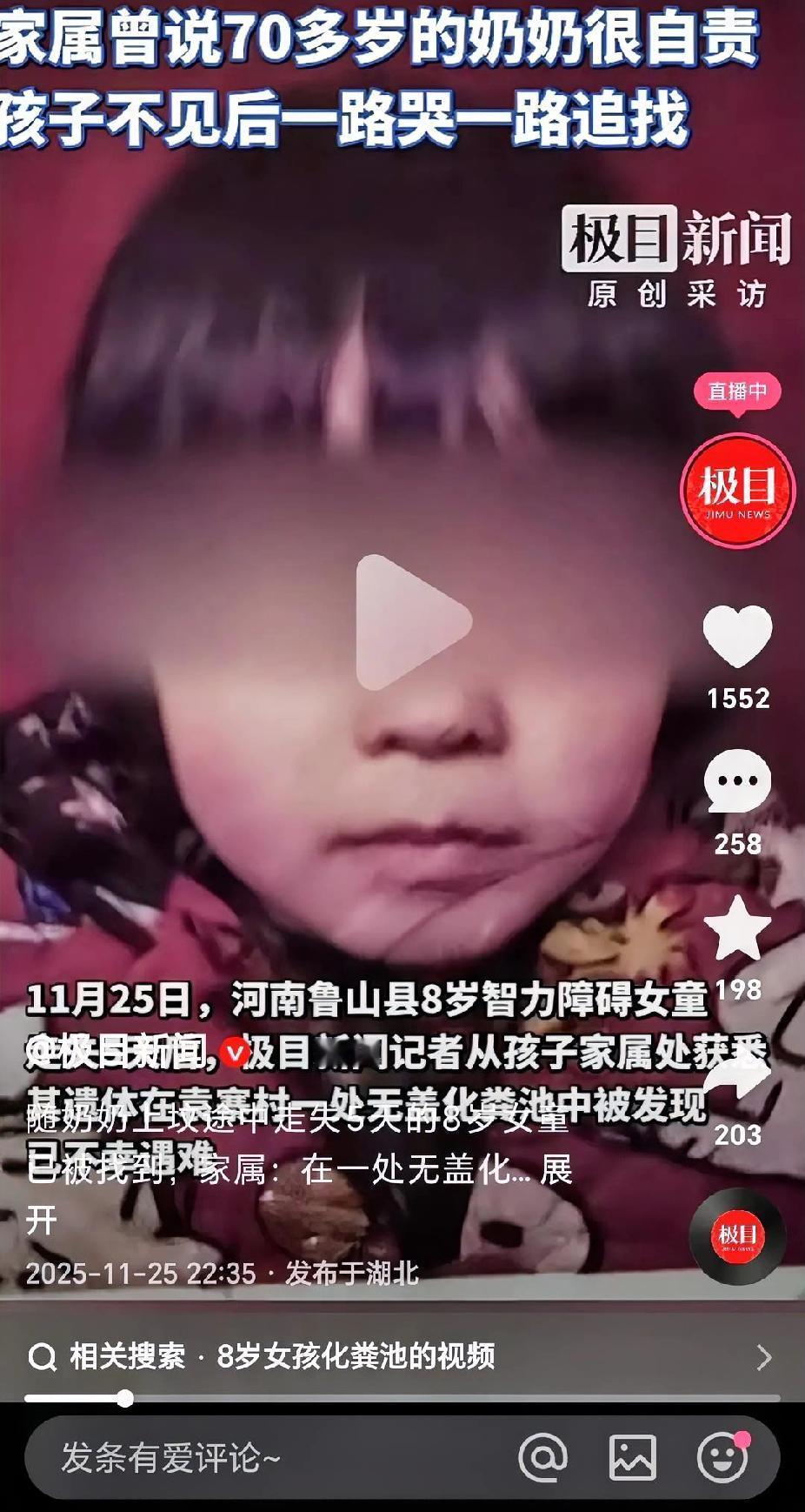 8岁女孩失踪5天,最新消息 不幸遇难!事发前奶奶把她用绳子绑起来。 “这是一场蓄谋已久的谋害”!很多网友表示,“这是故意而为之”! 事情经过:70多岁奶奶,带智力障碍孩子去上坟,回去途中,为了和亲戚说几句话,用绳子把孩子绑了起来!但是,孩子挣脱绳子,不见了! 最后,在化粪池里发现! 人为还是不幸,还在调查中,奶奶很自责! 孩子智力障碍,已经很可怜了,结果,又不幸掉进最肮脏的化粪池! 这辈子,你很不幸!希望下辈子,你能健健康康,有父母陪伴! 结语:看智障孩子很累,24小时不能离人。奶奶👵🏻会自责一辈子,她也不想的,看好了没有功劳,看不好会受到各种谴责!