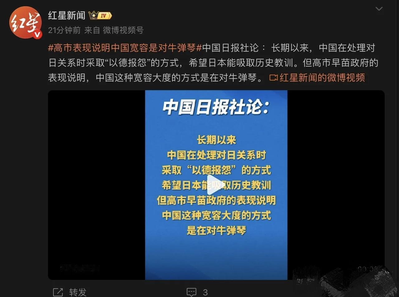 中国日报这话够狠!高市早苗还不收敛,中方反制已经在路上了。 最近日本首相高市早苗真是狂得没边了!这波操作简直是往咱们的底线心上戳,还好《中国日报》的社论直接怼回去,那句“对牛弹琴”真是说到大伙心坎里,可能还有人没摸清来龙去脉,咱捋得明明白白的。11月初高市早苗就在国会放狠话,说“台湾有事可能构成日本存亡危机事态”。这话可不是随便唠嗑,这是明着暗示要武力介入台海啊! 要知道日本有个新安保法,一旦认定是“存亡危机事态”,就能行使集体自卫权。这就相当于把台湾问题和日本的军事行动绑一块了,妥妥的干涉中国内政,突破了多少年的底线。更气人的是,中方连着好几次严正交涉,她倒好,不仅不撤回,还嘴硬说这就是日本政府的立场,简直狂妄到了极点。 而且这高市早苗从来就不是省油的灯。作为右翼死硬分子,她多次去参拜靖国神社,还老想着否认南京大屠杀这种铁打的历史事实。最近更离谱,居然琢磨着要修改日本的“无核三原则”,想打核武器的主意。要知道日本可是唯一一个挨过核打击的国家,她这么干,不就是在给军国主义招魂嘛! 别以为中方只会口头警告,真刀真枪的反制早就安排上了。现在咱们已经全面暂停进口日本水产品,好几家航空公司直接取消了十多条中日航线。文旅部也发了提醒,让大家谨慎安排赴日旅行。这些举措可不是闹着玩的,有估算说这会让日本损失超千亿人民币,像松下、索尼这些企业的供应链都受了冲击。 外交上咱们更是步步紧逼,外交部连着几天轮番严正抗议,还派大使把情况告到了联合国,明明白白警告日方,敢武力介入台海,必付出代价。这一套组合拳下来,日本国内也炸了锅,不少民众上街抗议,要求高市早苗辞职,经济界更是愁得睡不着觉。 《中国日报》作为国家级英文日报,这次用社论发声,分量可想而知。这可不是简单的批评,更像是个明确的信号:中方的宽容从来不是没底线,克制也绝不是软弱。之前对日本够客气了,可人家不领情还蹬鼻子上脸,那咱们也没必要客气。 现在就看高市早苗能不能认清现实了。要是还执迷不悟接着挑衅,那中方的反制肯定还得升级。毕竟台湾是中国的领土,这是《开罗宣言》《波茨坦公告》都定死的事实,谁想伸手过来抢,就得做好被打断手的准备!同意的家人们,评论区里顶起来!