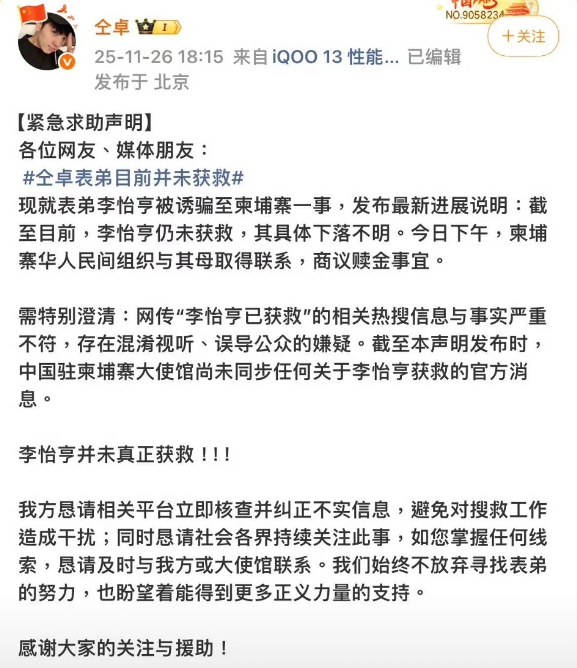 仝卓表弟在柬埔寨失联,发文求助24小时不到已成功获救。 11月25日,演员仝卓发布一条求助信息,称与其一起长大的表弟在11月13日外出工作后失去联系,其家人在通过各种方式在找人,并附带了弟弟母亲发布的详细求助信息。 据悉,李怡亨最后信号曾短暂出现在境外柬埔寨班迭棉吉省一带,“失联后,他曾通过手机给家里传来过几段模糊的消息,声音非常虚弱”“直到现在,我们一家都无法确认他的真实状况。” 11月26日下午,极目新闻报道称仝卓的表弟李怡亨于中午被成功营救,目前被安置在安全的地方。柬埔寨华人慈善互助协会称,李怡亨确实已被救出,但具体情况该协会工作人员称不便透露。随后,仝卓本人出来辟谣说目前表弟还没被救出,具体下落不明。 有网友推测,李怡亨应该是出了园区,但是是柬埔寨华/人/民/间组织接出来的,一般这种情况,人家是要收取一定的“辛苦费”的,所以目前就僵持在这里。仝卓发文里也表示,柬埔寨华人那边与被困人母亲正在商议赎.金事宜,但人应该是安全的。 可想,明星想捞人都困难,普通人遇到这种事该如何是好,大家还是要多警惕啊,不能掉以轻心!