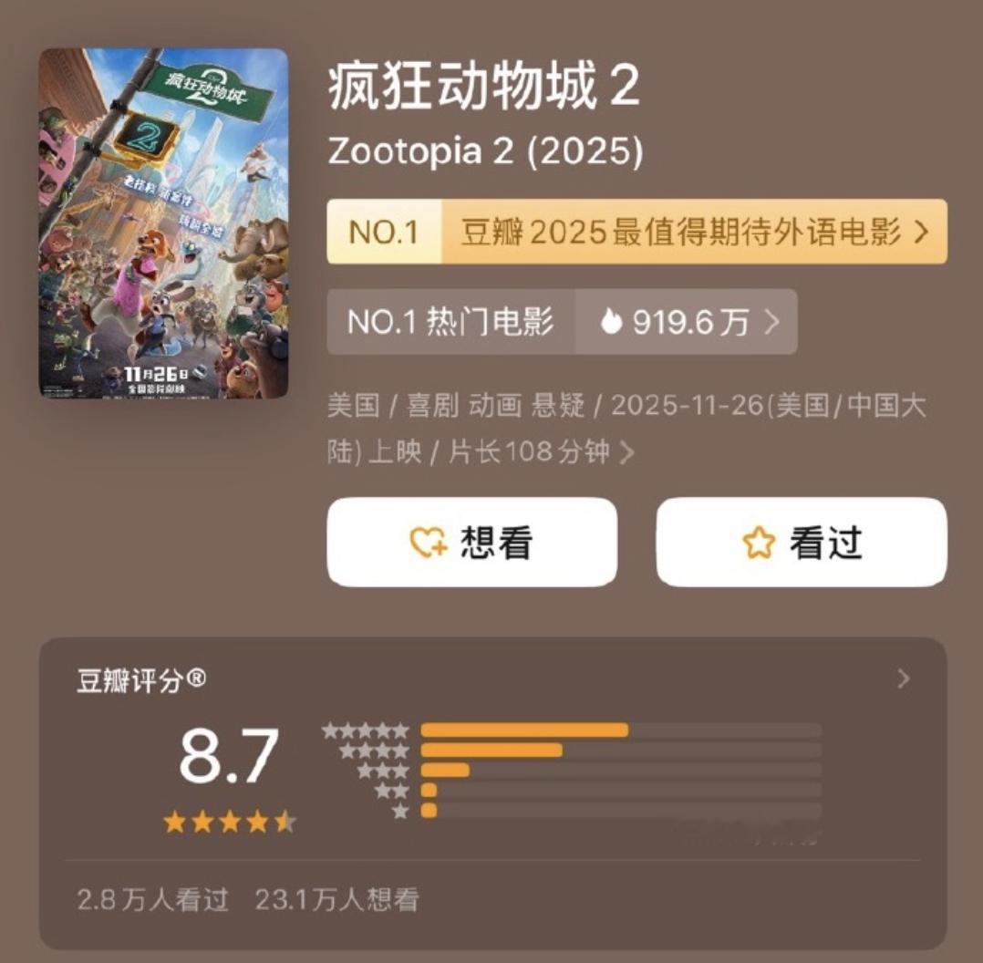 《疯狂动物城2》豆瓣开分8.7分,跟我感觉差不多。肯定没有第一部那么惊艳,但观感确实挺快乐。佳片奇遇季