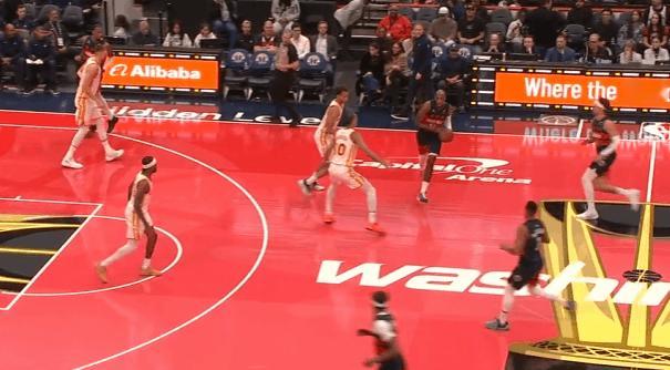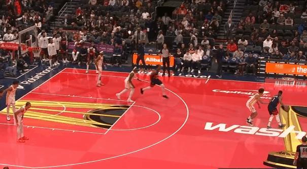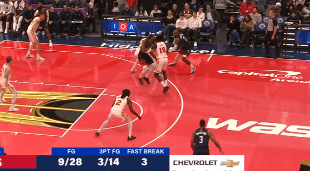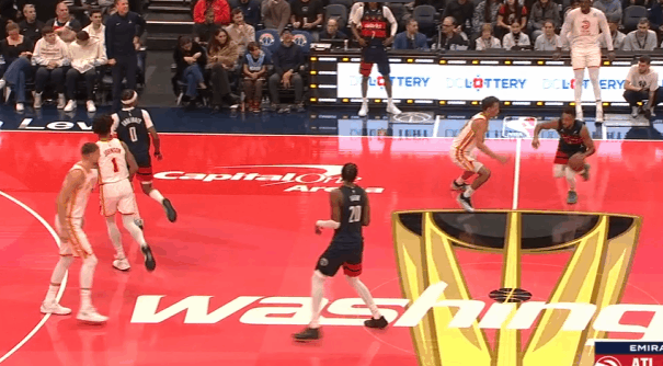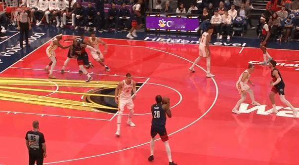 CJ麦科勒姆在今天奇才对阵老鹰的NBA杯赛中狂砍46分,打出了自己加盟奇才以来最佳的单场表演,最终带领奇才132-113狂胜老鹰19分,终结了14连败。图1弱侧接应,佯装交叉步启动右路突破,实则炸球撤步回拉,持球三分稳稳命中。图2早期进攻“Drag Screen”起手向左侧行进,“刺探急停”逼退延误的铂金后迅速衔接炸球撤步三分。图3弱侧接应米尔德顿,接球虚晃后下球,“哈达威变向”晃飞基顿重心后启动右路突破直杀篮下,上篮取分。图4无球起手接球后再迅速衔接和萨尔的边路挡拆配合,将戴森卡在身后,随即出手抛投惩罚沉退的铂金。图5“Flex Rip STS”:CJ为米德尔顿设置“Flex Screen”米德尔顿前往低位接球后发牌作为“战术起手式”,随后CJ再为基斯伯特设置“Rip Screen”后执行STS(为掩护人掩护)借助萨尔的无球掩护上提后接米尔德顿发牌接球三分命中。火箭有个很相似的战术图6、图7(此前讲过网页链接),与奇才的这个战术回合相比,区别只是在于“战术起手式”略有不同。图8操刀半场最后一攻,呼叫萨尔上提掩护后直接拒绝掩护右路突破,胯下迅速合球的同时完成“脚步重置”随后立即出手持球三分,这记三分命中奇才半场已经领先老鹰22分。图9、10、11转换追身三分。NBA奇才战胜老鹰 麦科勒姆46分