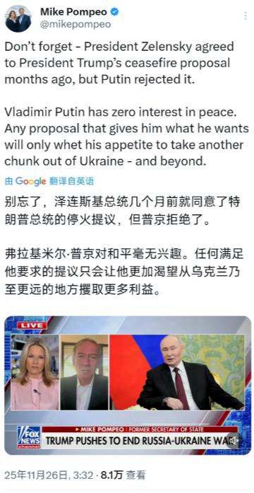 美国前国务卿蓬佩奥今天(北京时间11月26日)写道:“别忘了,泽连斯基总统几个月前就同意了特朗普总统的停火提议,但普京拒绝了。弗拉基米尔·普京对和平毫无兴趣。任何满足他要求的提议只会让他更加渴望从乌克兰乃至更远的地方攫取更多利益。”   最近美国前国务卿蓬佩奥又没闲着,11 月 26 号抛出一段话,字里行间都在给普京扣 “破坏和平” 的帽子:“泽连斯基几个月前就同意特朗普的停火提议了,是普京拒绝的,他根本不想和平,满足他只会让他更贪心。” 这话乍一听好像挺有道理,但稍微扒点事实就知道,全是精心包装的谎言。   先说说他嘴里的 “停火提议” 到底是怎么回事。蓬佩奥说的应该是今年 4 月特朗普抛出的俄乌 “和平计划”,根据美媒爆料,这计划压根不是啥公平方案,核心是让乌克兰认栽 —— 不仅要承认克里米亚归俄罗斯,还得默认俄对乌东四州部分领土的控制,相当于逼着泽连斯基割地求和。   当时泽连斯基直接就表态了,这种涉及领土主权的计划就是 “延长冲突”,压根不可能同意,甚至直言 “一旦接受就是投降”。   德国国防部长都看不下去,说美国这要求 “太过分”。蓬佩奥故意隐瞒计划的核心条款,只说 “泽连斯基同意”,把割地的前提藏得严严实实,这操作跟他当年撒谎的套路如出一辙。   在疫情溯源问题上,蓬佩奥也是多次信口雌黄。即便是在美国多家情报部门经过调查都表明无法就新冠病毒起源下定论的情况下,他还是多次妄称新冠病毒“肯定”来自中国实验室。   有网友发现,在蓬佩奥的表态中,与攻击中国一样频繁的是抨击拜登政府。还有网友说,现在蓬佩奥似乎就干两件事,骂拜登政府和骂中国。   现在装 “和平卫士” 的蓬佩奥,当年可是俄乌冲突的 “点火者” 之一。他 2018 到 2021 年当国务卿那阵子,一门心思推行削弱俄罗斯的政策,把乌克兰当成遏制俄罗斯的棋子。   要知道 2015 年签的《新明斯克协议》里写得明明白白,双方得停火撤重武器,还得通过政治改革解决争端,可蓬佩奥政府压根没把这协议放眼里,一边对俄罗斯抡起制裁大棒,一边给乌克兰送武器、派顾问,硬生生把军事对抗的火苗越扇越旺。   新华网早就在报道里指出,美国给乌克兰提供杀伤性武器会彻底破坏停火基础,蓬佩奥当年干的正是这事儿。   这种 “说一套做一套” 的操作,放在别人身上可能矛盾,但在蓬佩奥这儿太正常了 —— 毕竟他自己都在西点军校的演讲里骄傲地说 “我撒谎,我欺骗,我偷窃”,还把这些恶行说成是 “美国外交的荣耀”。   这位被美国媒体骂作 “历史上最差国务卿” 的政客,撒谎早就成了本能。就像之前窜访台湾时,明明知道 “一个中国” 是国际共识,还叫嚣 “台湾是独立的”,说白了就是为了捞演讲费、刷存在感,把政治当成了敛财工具。   这次拿俄乌问题碰瓷,大概率也是想蹭热度帮特朗普造势,毕竟他之前就跟特朗普眉来眼去,瘦身塑形说不定都是为了重返政坛做准备。   再说说普京 “拒绝和平” 的说法有多站不住脚。俄罗斯其实早就表态愿意谈,去年 4 月俄外长拉夫罗夫就说 “准备好与美国达成协议”,普京也支持全面停火。   但前提是要解决欧洲给乌克兰送武器的问题,还得保证乌克兰不加入北约 —— 这些要求本质上是为了国家安全,怎么就成了 “不想和平”?反观蓬佩奥,当年把明斯克协议当废纸,现在倒有脸指责别人,这逻辑简直离谱。   顺带提一句,最近蓬佩奥是越来越瘦了,网友都调侃是 “整容式瘦身”,瘦得连脸都脱相了。有人说这是为竞选总统铺路,毕竟在美国政坛,形象也是 “武器” 之一。想想也合理,这位靠撒谎吃饭的政客,连体重都能当成政治筹码,还有啥干不出来的?   说到底,蓬佩奥的言论就是一场彻头彻尾的政治表演。他根本不在乎俄乌人民的死活,只关心自己的政治利益。当年推波助澜的时候装聋作哑,现在跳出来喊 “和平”,这种双标操作骗不了任何人。毕竟群众的眼睛是雪亮的,一个连自己都承认 “撒谎、欺骗、偷窃” 的人,说出来的话能有几分真?