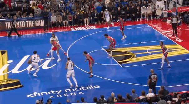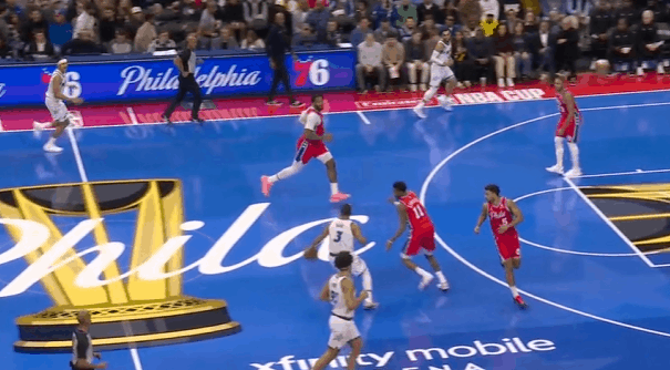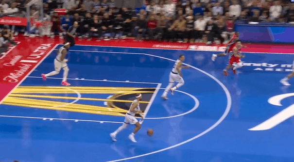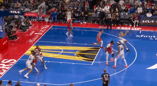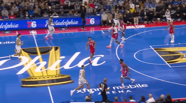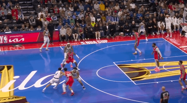 安东尼-布莱克在今天魔术对阵费城76人的比赛中,打出了自己迄今为止生涯最佳的一场比赛。在三分手感在线、凭借年轻优势大量快攻取分的情况下,投篮17中12砍下31分3助攻。图1这个回合替补上场后先用一记快攻单臂战斧劈扣打开得分账户。图2破联防,接球后先是佯装起球投篮,再佯装分给插罚球线的彭达,通过连续的假动作调度戈登防守位置,使其远离弧顶的琼斯后立即回给琼斯。图3费城2-3联防,琼斯与比塔泽挡拆的同时布莱克强侧空手移动上提,形成局部多打少,琼斯的挡拆吸引爱德华兹上提后布莱克再迅速向底角移动获得投篮空间。图4早期进攻左路突爱德华兹,沉肩对抗后佯装起身衔接跳投,晃飞爱德华兹防守重心后迅速衔接上下步挑篮终结。图5马克西没有快速回防,庄神的防守注意力也完全被贝恩吸引没有注意对人,布莱克左路跟进,接球前就已经开始加速启动,接球后迅速奔向篮下,炸球调整后起步上篮,非常漂亮的拉杆反篮2+1。图6费城2-3联防,琼斯与彭达的中路挡拆吸引马克西回收,随后回给弱侧45接应的贝恩,贝恩接球吸引巴洛上提干扰后迅速传导给底角的布莱克,布莱克佯装交叉步启动右路突破,实则反胯拉回衔接撤步三分。图7魔术快发底线球推起转换,最前线的安东尼接萨格斯后场长传高高跃起双手灌框。图8给瓦格纳设置“Flex Screen”后再借助卡特的“Pin Down”(下掩护)“Curl”(卷切)篮下,合球点起庄神后上篮打进2+1。魔术9人得分上双魔术战胜76人