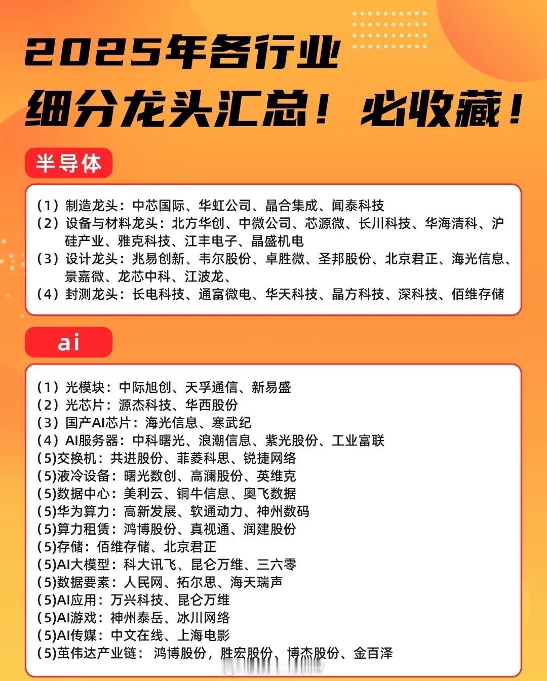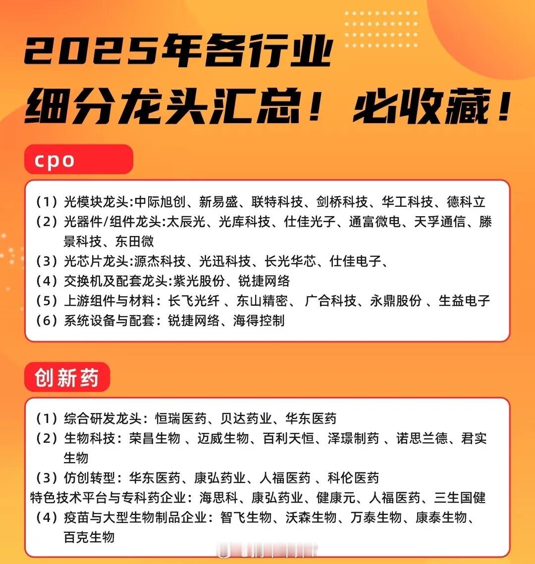 2025年各行业细分龙头汇总主要涵盖半导体、AI、有色金属、机器人、CPO、创新药等领域,具体如下:半导体分为制造、设备与材料、设计、封测四类龙头,制造龙头包括中芯国际、华虹公司等;设备与材料龙头有北方华创、中微公司等;设计龙头含兆易创新、韦尔股份等;封测龙头为长电科技、通富微电等。AI覆盖光模块、光芯片、国产AI芯片、AI服务器、交换机、液冷设备、数据中心、华为算力、算力租赁、存储、AI大模型、数据要素、AI应用、AI游戏、AI传媒、英伟达产业链等领域,例如光模块龙头为中际旭创、天孚通信等;国产AI芯片龙头有海光信息、寒武纪;AI服务器龙头包括中科曙光、浪潮信息等。有色金属涉及钴、锂、镍、稀土、永磁、黄金、白银、铜、铝等金属领域,钴龙头有华友钴业、寒锐钴业等;锂龙头包括赣锋锂业、天齐锂业等;稀土龙头含盛和资源、北方稀土等;黄金龙头有紫金矿业、中金黄金等。机器人分为核心零部件、本体制造与系统集成、机器视觉与AI软件、关键材料与基础部件、新兴驱动与潜在应用五类,核心零部件龙头如汇川技术、绿的谐波等;本体制造与系统集成龙头包括埃斯顿、埃夫特等;机器视觉与AI软件龙头有奥普特、天准科技等。CPO包含光模块、光器件/组件、光芯片、交换机及配套、上游组件与材料、系统设备与配套六类,光模块龙头为中际旭创、新易盛等;光器件/组件龙头有太辰光、光库科技等;光芯片龙头含源杰科技、光迅科技等。创新药分为综合研发、生物科技、仿创转型、特色技术平台与专科药企业、疫苗与大型生物制品企业四类,综合研发龙头如恒瑞医药、贝达药业等;生物科技龙头包括荣昌生物、迈威生物等;疫苗与大型生物制品企业龙头有智飞生物、沃森生物等。