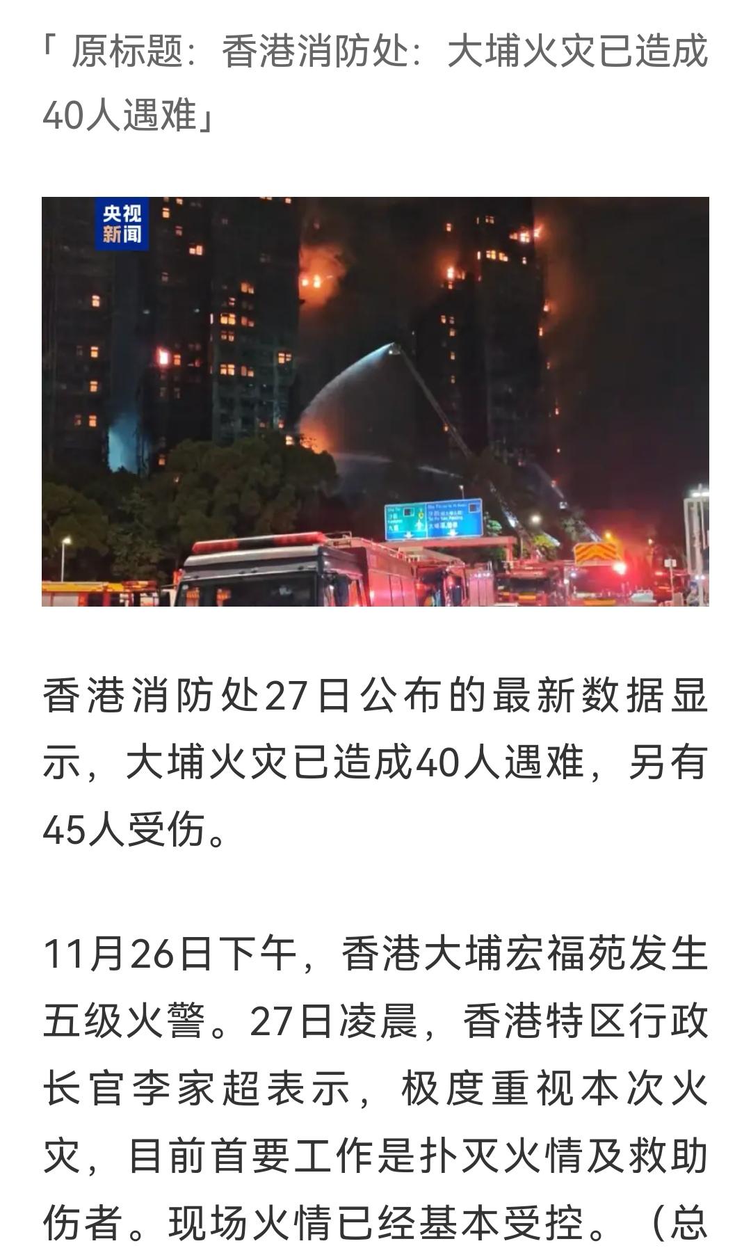 香港消防处:大埔火灾已造成40人遇难,死亡人数上升。祈祷🙏祈祷平安!祈祷🙏🙏🙏🙏
