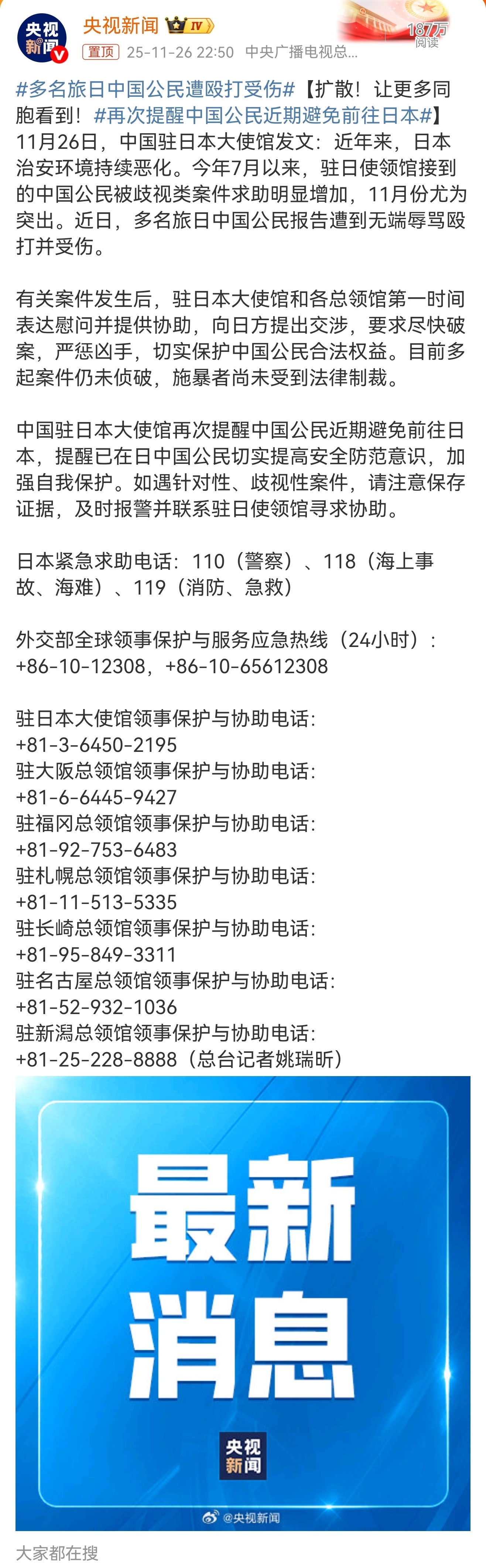 同胞遇袭敲响警钟,日方需担起安全之责中国驻日使馆的安全提醒,背后是多名旅日同胞无端遭辱骂殴打、甚至重伤的痛心现实。从东京台胞遭有预谋铁棍袭击,到7月以来歧视类案件激增,日本治安恶化与针对华人的暴力事件频发,绝非偶然。这一现象的背后,与日本部分政客炒作涉台议题、煽动对华负面情绪密切相关,而日方对相关案件常以普通伤害罪轻描淡写,回避仇恨动机调查,更显纵容。安全是公民海外出行的底线,同胞在异国他乡的人身安全不容漠视。日方理应正视问题本质,严惩施暴者,采取有效措施改善治安、消除歧视,切实保障在日中国公民合法权益。同时,也提醒同胞密切关注安全提示,谨慎规划出行,若遇危险及时联系使领馆求助。维护海外同胞安全,既是祖国的坚定立场,也是日方不可推卸的国际责任。多名旅日中国公民遭殴打受伤