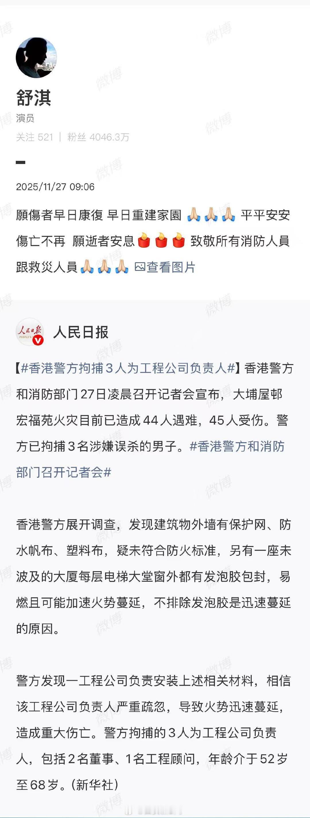 【舒淇为香港同胞祈福】11月27日,舒淇发文:願傷者早日康復 早日重建家園 平平安安 傷亡不再 願逝者安息 致敬所有消防人員跟救災人員