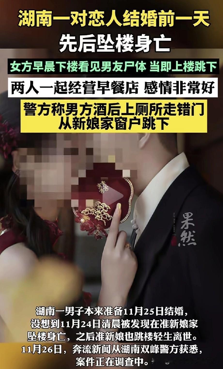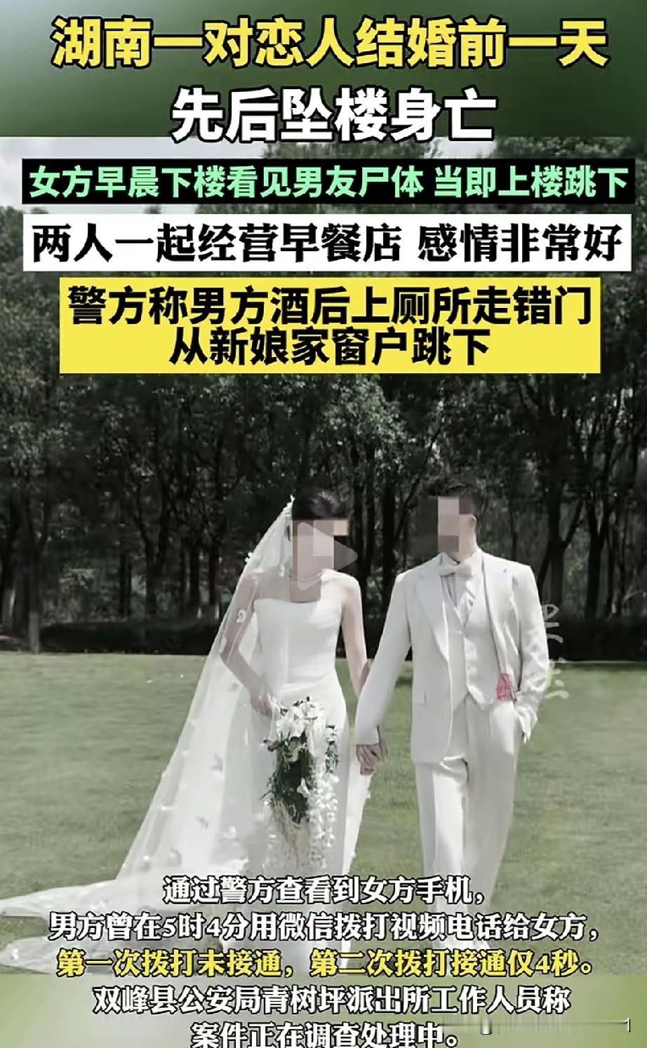 湖南有一对新人在结婚前一天先后跳楼身亡。 警方调查表明,男子酒后上厕所时走错门,从新娘的窗户处坠楼。女子早上被楼下的动静惊醒,母亲告诉楼下出事了她下楼看到男友的尸体,受刺激后返回楼上也跳了下去。警方查看女方手机发现,其男友在5时4分给她打视频电话,女方未接,第二次拨通后仅持续了4秒钟。 男方是酒后上厕所走错门从窗户坠楼的。这是什么逻辑?究竟是什么意思呢?这话是男死者说的吗? 不可能仅仅因为喝醉酒就跳楼,如果真是这样,女方也不会跟着跳,肯定是背负债务或者遭遇了重大变故。凌晨五点,男方为何发微信视频,第一次女方没接,第二次接通却只通了几秒? 唯一合理的推测是,男的摔下去时电话还在手上,他打视频电话是为了求救。女方睡得迷迷糊糊,没接第一次电话。第二次电话接通,男方已说不出话,女方以为是男友在开玩笑或者误拨,便挂了电话又翻身睡去。早上楼下喧闹惊叫她都没醒,是因为前一晚没睡好。 后来她被母亲叫醒,才得知出事了,受刺激之下也选择了跳楼。