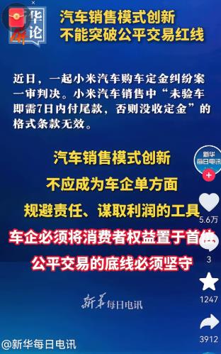 汽车销售模式创新,让人大开眼界。以前只听说技术创新、产品创新,百年汽车工业,却在销售模式方面实现了突破、实现了销售模式创新,未验车却要求7日内支付尾款,否则没收定金,这确实汽车发展史上比较罕见。如其把精力用在销售模式创新上,不如把更大的精力用在技术创新、产品创新,提高产品质量安全上。