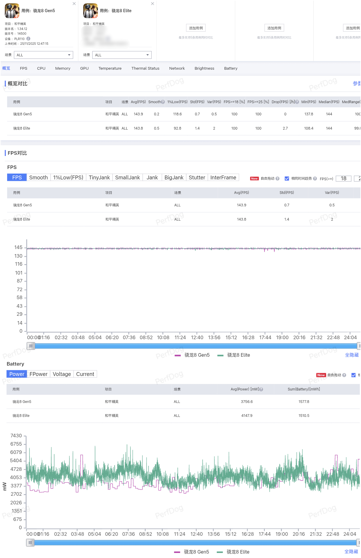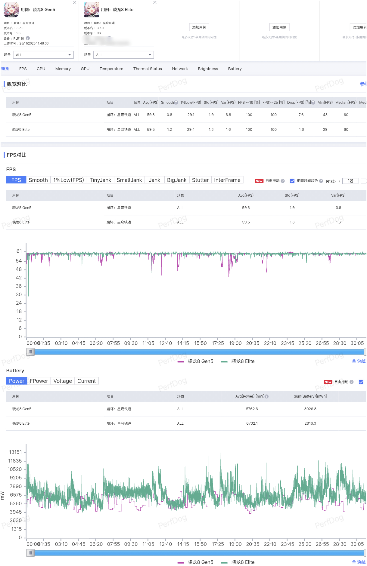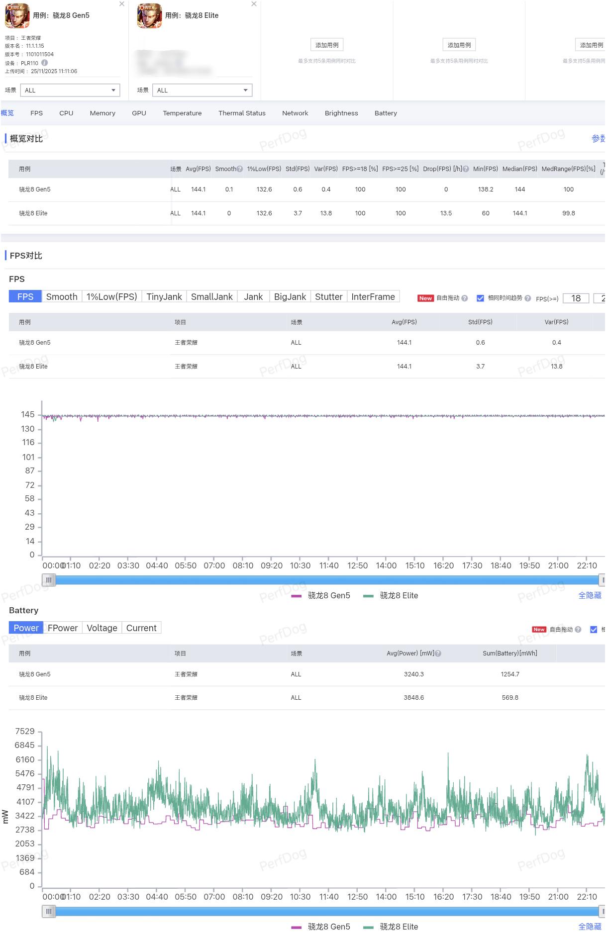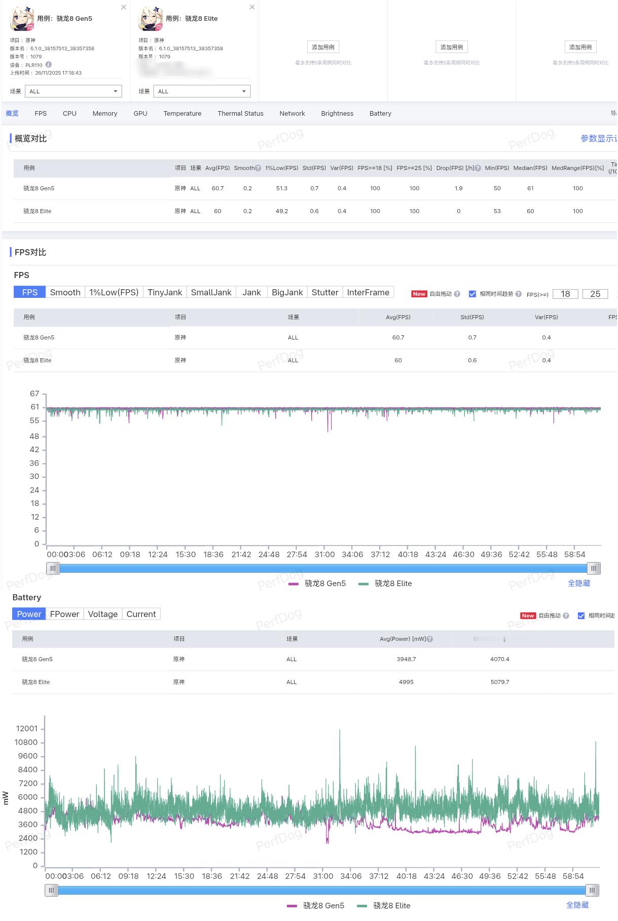 一加Ace6T &骁龙8 Gen5真机实测:●咱们直接对比骁龙8 Elite新机,首先在中低负载的《王者荣耀》实测中,一加Ace6T首批适配144FPS超高帧模式,游戏帧率和8E机型一样拉满,但功耗比8E机型更低,平均仅3.24W;●在中负载《和平精英》实测中,一加Ace6T同样基本持平8E机型,同样功耗更低,台积电N3p+8E5同款架构发力了?!●来到高负载《原神》实测中,一加Ace6T一小时长测平均帧数60.7FPS,游戏功耗3.95W,整整比8E机型低了1W,不愧是硬件级风驰内核。●超高负载《星穹铁道》黄金的时刻,Ace6T平均帧数59.3FPS,帧率波动会比8E更明显,峰值游戏表现略逊于8E,但功耗同样低了1W。●除此之外,一加Ace6T还支持165Hz超帧游戏生态,《三角洲行动》《QQ飞车》都能近乎满帧运行,吃鸡165帧也在内测中,体验更畅快。简单来说,一加Ace6T这颗骁龙8 Gen5表现确实不错,得益于8E5同款架构工艺+风驰内核,大部分游戏体验都优于骁龙8 Elite机型;一加Ace6T电池做到了8K++,还有金属中框+超声波指纹+满级防水,现在就坐等发布了一加Ace6T性能实测