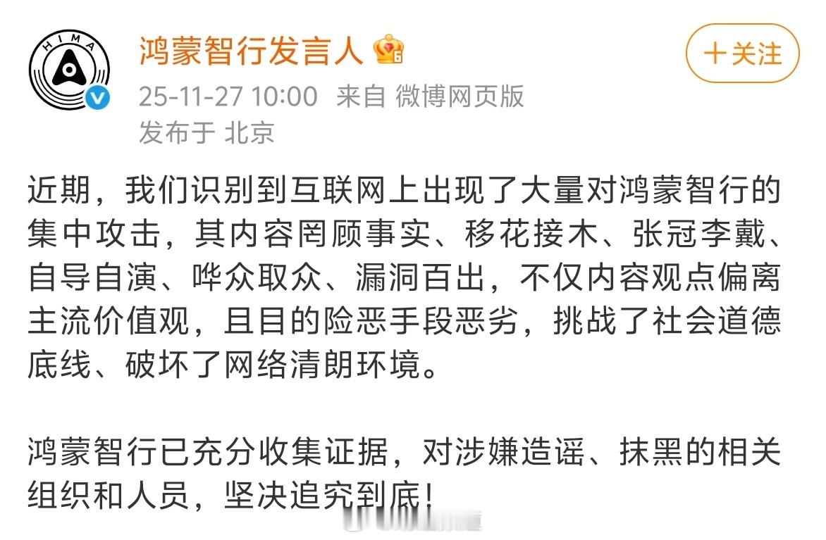 鸿蒙智行识别到互联网上对鸿蒙智行的集中攻击,已取餐,坚决追究到底。有点意思,我只想说:公道自在人心