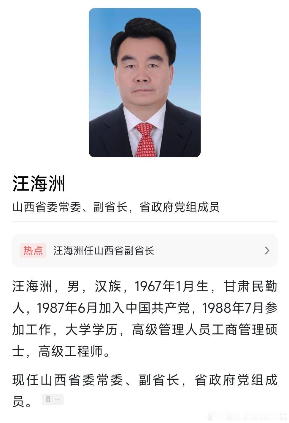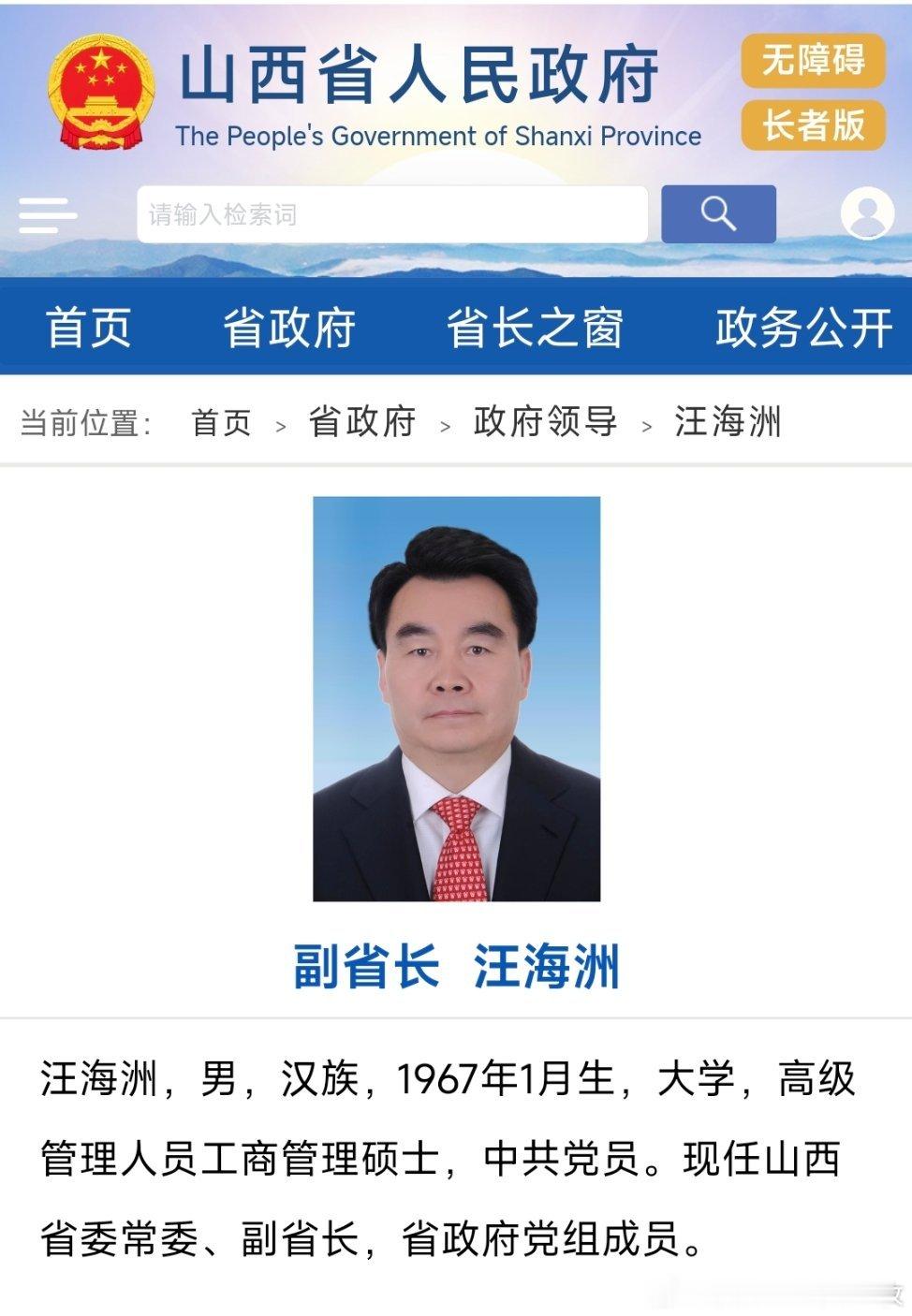 山西省人民政府网站11月26日更新后显示,汪海洲已任山西省委常委、副省长、省政府党组成员,排在山西省委常委、常务副省长、省政府党组副书记董晓宇之后。热点现场