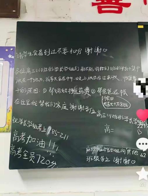 安徽,一名高二学生,为了帮妈妈挣医药费,帮爸爸还账,放学后收瓶子去卖,他在黑板留言,希望学长学姐把空瓶子留下。学校回应:每班已为该生专门设立了存放废瓶容器。 放学铃一响,安徽一所高中的走廊里,16岁的小郭(化名)背着书包,没有和同学去打球、逛街,而是默默走向各个班级的角落。 他熟练地拿起每个教室门口的塑料桶,把里面的空瓶子挨个装进编织袋,动作轻手轻脚,生怕打扰到还在学习的同学。 谁能想到,这个高二男生每天雷打不动的“兼职”,竟是为了给生病的妈妈凑医药费,帮爸爸还十万多元的农田债务。 事情的转折,源于他在高三教室黑板上的一段留言。 那天放学后,小郭鼓起勇气写下:“亲爱的学长学姐,能不能把你们班的空瓶子集中放在一个地方,我来收,这样能帮我减轻一些家庭负担。 谢谢你们,也祝你们高考顺利。” 没有卖惨,没有乞求,短短几句话,既说清了缘由,还不忘送上祝福。一位老师偶然看到后,心里五味杂陈,立刻打听了小郭的情况。 原来小郭的妈妈常年生病,药费像座大山压着全家,爸爸种着几亩田,辛苦一年不仅没赚钱,还欠了外债,家里的日子过得捉襟见肘。 了解情况后,学校没有大张旗鼓地募捐,而是悄悄做了件暖心事。每个班级都多了一个专门的废瓶收集桶,老师和同学们心照不宣,喝完的饮料瓶都会主动放进去,没人多问一句,也没人用异样的眼光看小郭。 现在小郭不用再挨个教室四处找瓶子,每天放学花十几分钟就能收完,既不耽误学习,也避免了尴尬。 他每次收瓶子时都低着头,脸上带着腼腆的笑,把袋子捆好后,骑车送到废品站,换来的几十块钱,全部交给妈妈。 有人问他累不累,小郭摇摇头说:“能帮家里分担一点是一点,爸妈太辛苦了。” 这个还没成年的孩子,用最朴素的方式扛起了家庭的责任。 他没有因为家境困难而自卑,反而更懂得感恩,收瓶子时遇到同学,还会主动打招呼,学习成绩也一直保持在班级中游。 反观现在很多孩子,衣来伸手饭来张口,根本体会不到父母的辛劳。小郭的故事没有惊天动地,却让人心里暖暖的。 他让我们看到,困境面前,懂事和努力是最珍贵的品质。 而学校的做法更值得点赞,没有过度关注,没有刻意帮扶,只用一个收集桶,就保护了孩子的自尊心,既解决了实际问题,又传递了温暖。 教育从来不只是教知识,这种润物细无声的关怀,才是最动人的教育。 生活从来不容易,但总有人在默默坚持。 小郭用自己的双手为家庭撑起一片天,也用行动告诉我们:平凡的人,也能活出不平凡的担当。 你被小郭的懂事打动了吗?