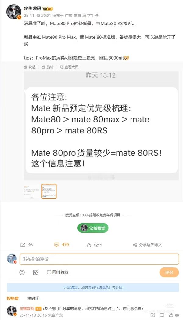 华为Mate80系列备货量曝光华为Mate80系列首批仅备货30万台,系列破千万应该没问题吧!
