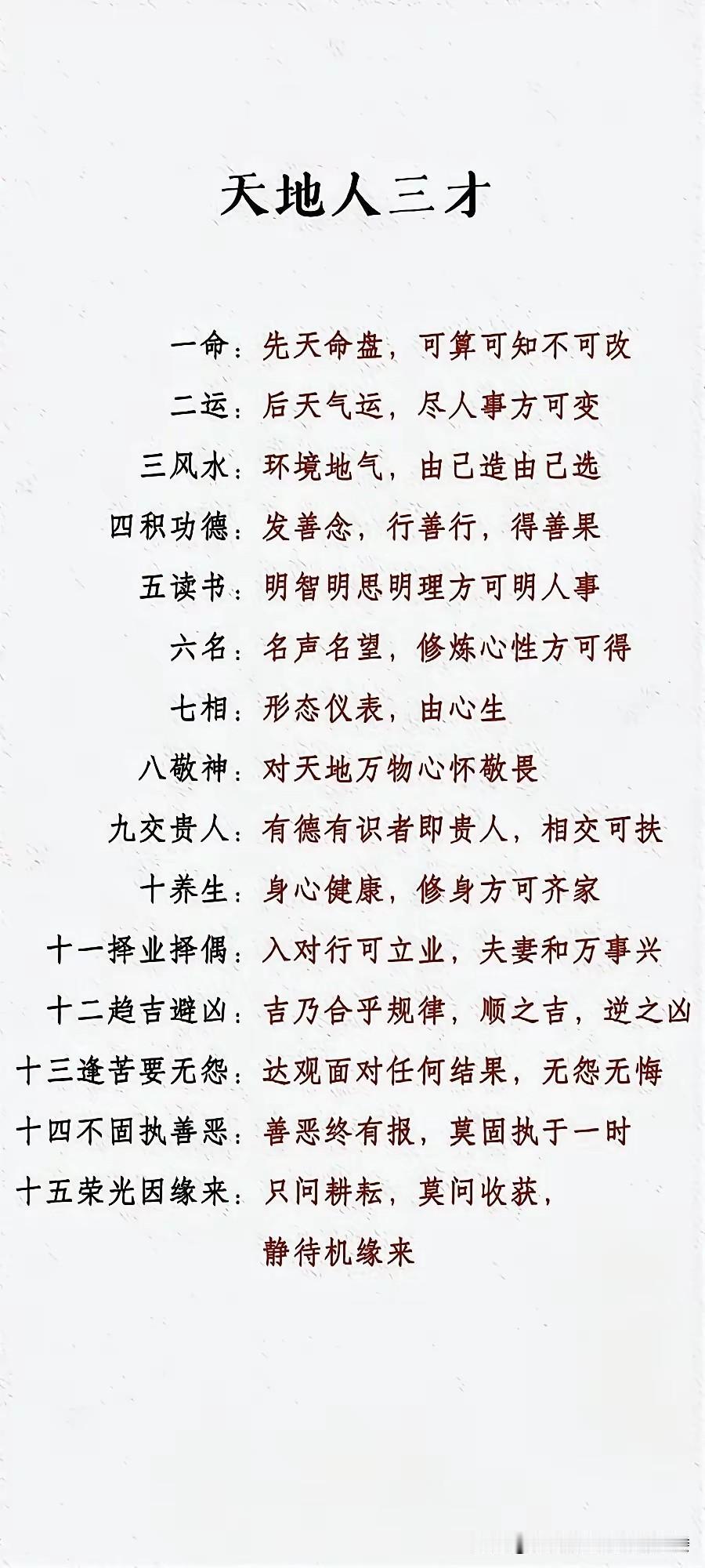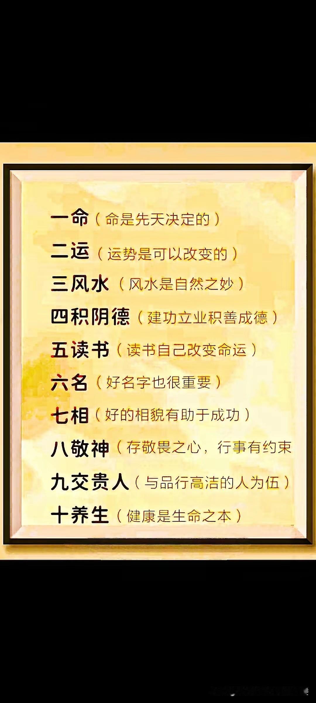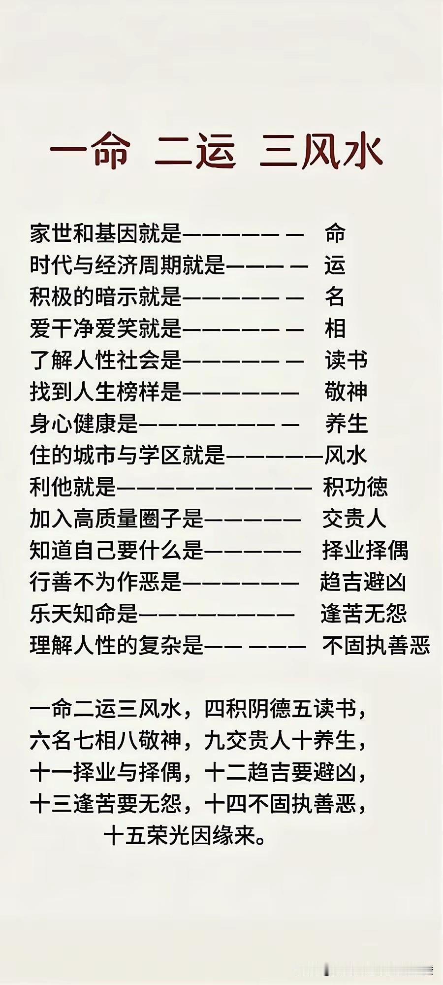 命,乃先天所赋,是一出生便置身罗马,与一降生即为牛马的天壤之别。运,关乎时代与大环境,乱世中不幸殒命之人,皆因时运不济。风水,代表小环境,恰似生活在闹市区与贫民窟的显著差距。而读书、积阴德、求名利、修相貌、善交友,这些皆是个人的修行。