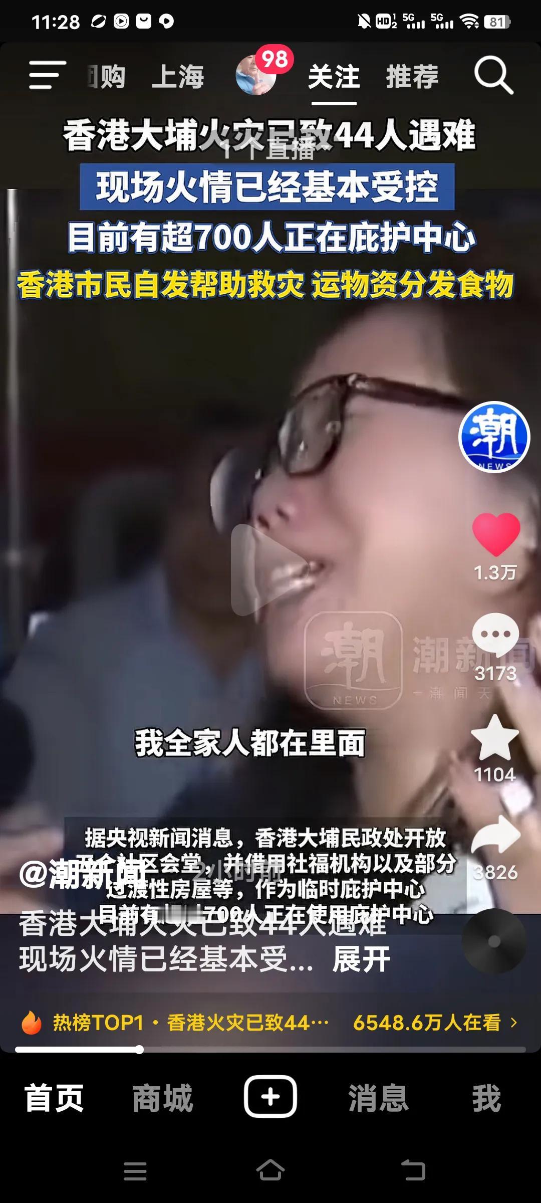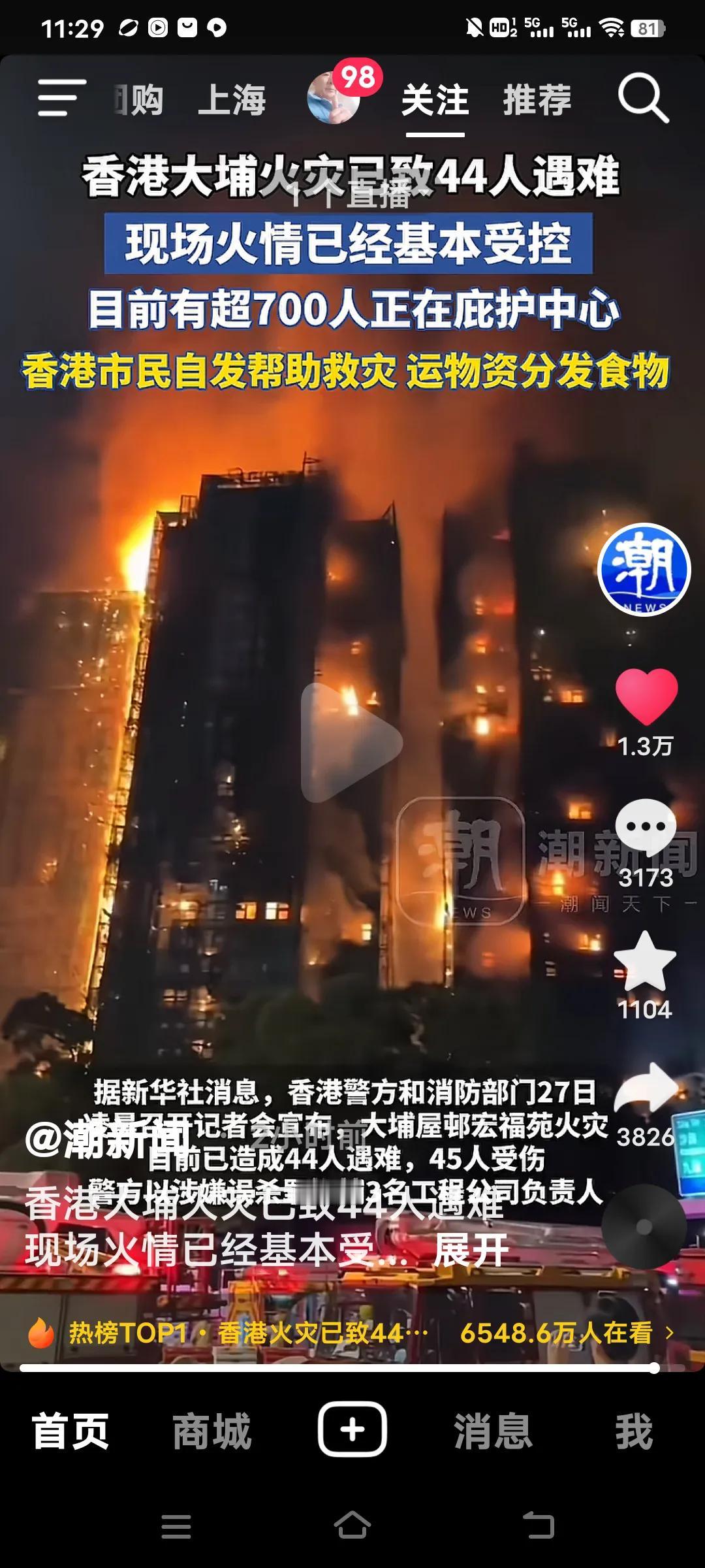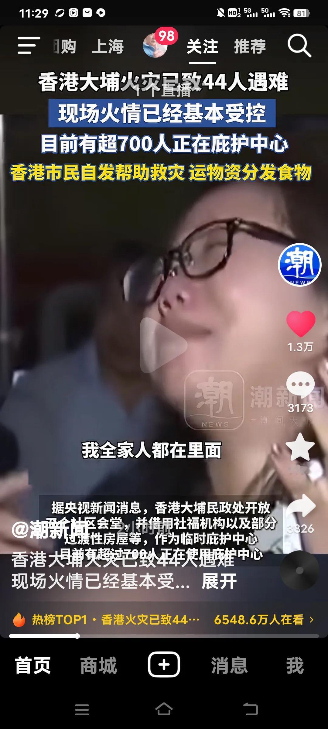 11月26日下午,香港新界大埔屋邨宏福苑多栋住宅楼那场火灾,真的太让人痛心了。这场火灾波及8幢大厦中的7幢,香港消防处都发出了除“灾难级”外的最高5级火警。 到27日凌晨,已造成44人遇难、45人受伤,还有700人在庇护中心。目前火情基本受控,特区政府各部门全力应对。不过,香港警方以涉嫌误杀罪拘捕了负责维修大厦的工程公司三名负责人,初步判断是多处杂物及竹棚被点燃,还因风势蔓延。这场悲剧让人无比惋惜,希望逝者安息,伤者早日康复,后续调查能给大家一个交代。 一位中年妇女哭说到她全家人都在里面呀!这样的灾难说谁也不想看到,跑掉一个是一个呀!评论区有网友讲,现在的条件火能着那大?是呀!说到底,火着起来就不好控制了呗,损失惨重呀!主要是人命关天呀!香港物流火灾 香港中环火灾