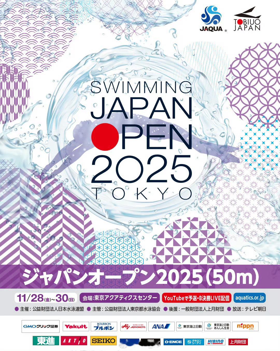 日本游泳公开赛 (11.28-30)男子部分选手报项松下知之:200/400混、200自村佐达也:200/400自、100蝶松元克央:50/100自、50/100蝶大桥信:50/100/200蛙渡边一平:50/100/200蛙深沢大和:50/100蛙谷口卓:50/100蛙花车优:100/200蛙竹原秀一:50/100/200仰西小野皓大:50/100/200仰牧野航介:200/400混、200蛙西川我咲:200/400混小岛梦贵:200/400混、100仰沼田赖人:200/400自、200混今福和志:400/800/1500自水沼尚辉:50/100蝶五味智信:100蝶、100自寺门弦辉:100/200蝶、400混本多灯:100/200蝶、200混松本周也:50/100/200自小方飒:200/400混、100/200蝶🇦🇺Cameron McEvoy:50自🇦🇺Matthew Temple:50/100蝶、100自🇦🇺Flynn Southam:50/100/200自🇦🇺Max Giuliani:50/100/200/400/800自🇦🇺Joshua Yong:50/100蛙🇦🇺Brendon Smith:200/400/800/1500自、200/400混、200蝶🇰🇷金煐汎:50/100蝶🇰🇷尹志焕:50蝶🇰🇷曹成载:100/200蛙