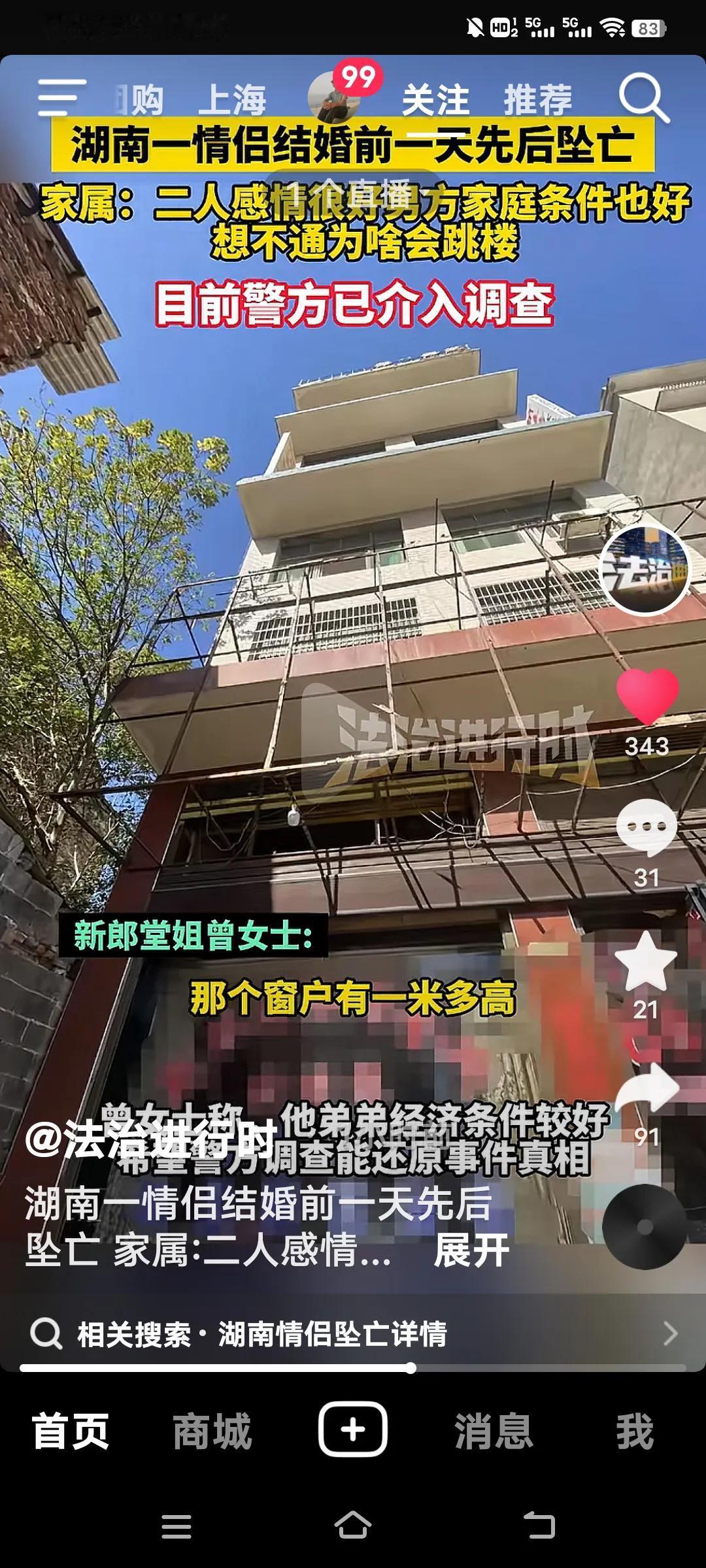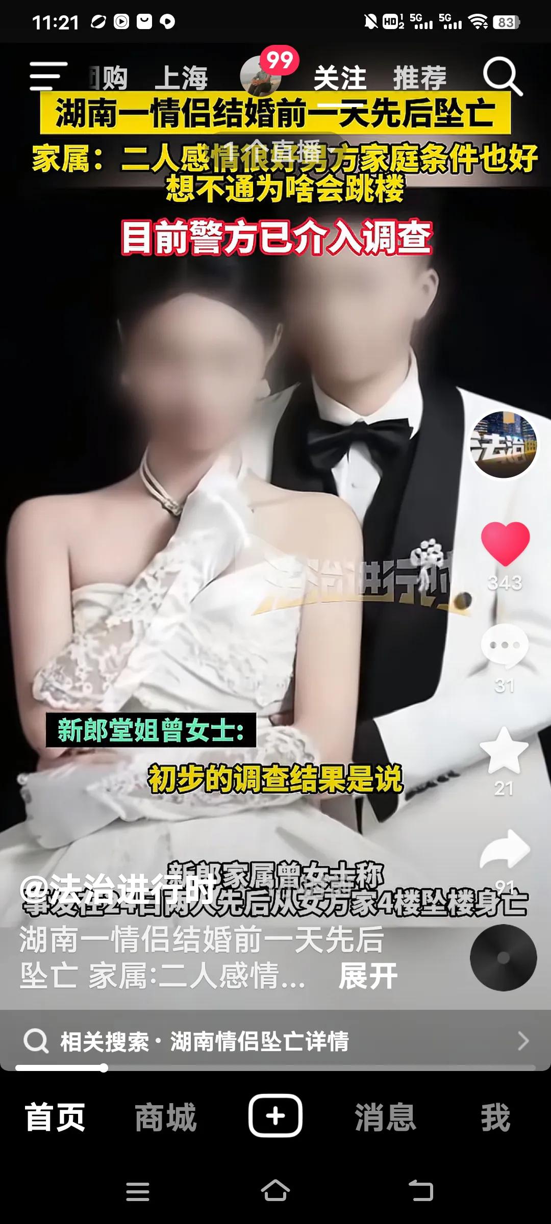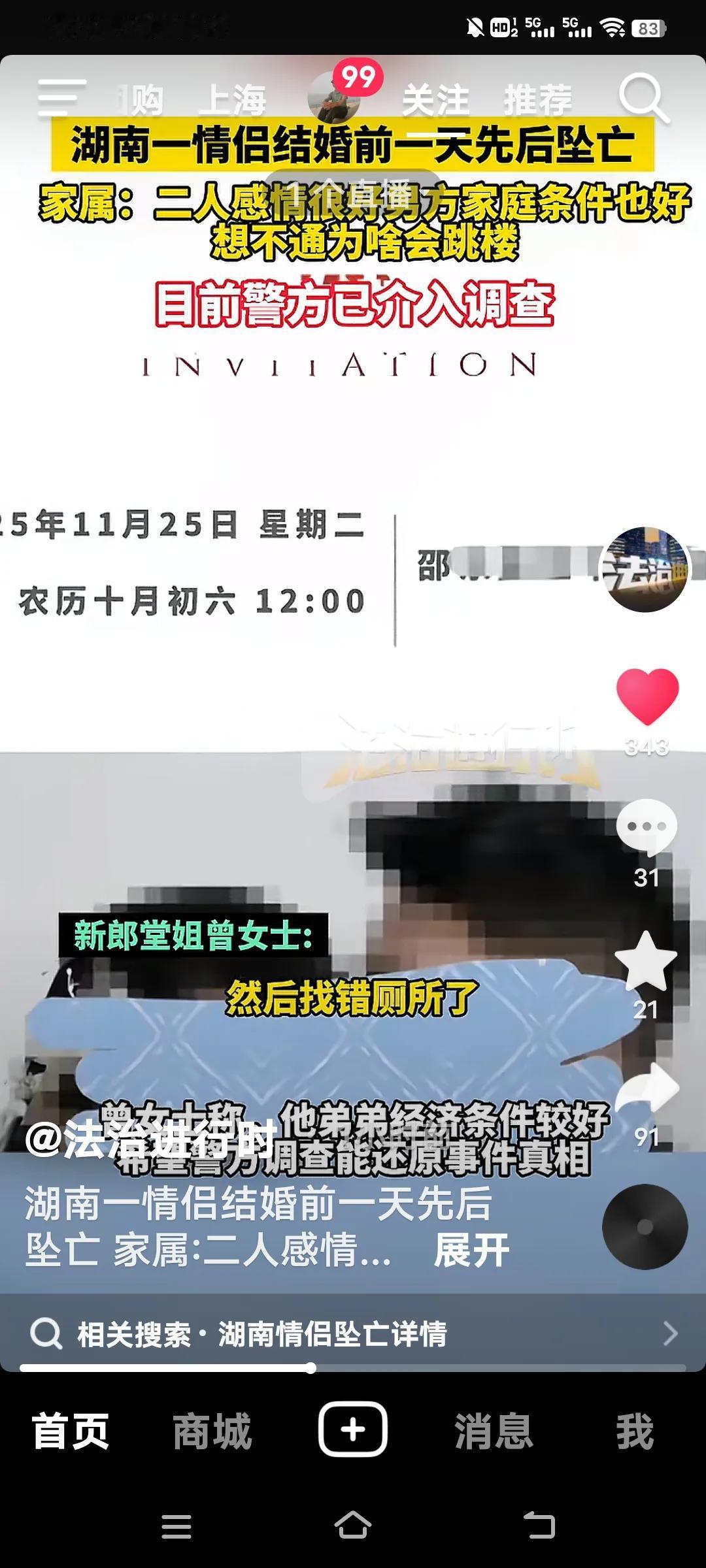 湖南这对恋人的悲剧太让人痛心。25岁的新郎和相恋五六年的女友,本定于11月25日结婚,却在24日凌晨两人结束了生命。警方调查排除刑事案件,新郎是意外坠楼,新娘目睹男友尸体后,相隔一个多小时也自主坠楼。新郎的堂姐曾女士说真是没有想到呀! 新郎堂姐说,23日晚两人聚餐后回女方家,初步查明是醉酒。新郎是喝醉酒了,误把窗户当厕所了从新娘家的4楼一脚下去就生命无归了,新娘随后也跳楼,下午抢救无效离世。他。新郎堂姐说他们两个人的感情甚好,也住在一起了。经济条件不错还没彩礼纠纷,希望警方调查能还原事件的真相。 不得不承认,新娘确实是个有情有义之人呀,让天天下人感动了。真想不到会是这样的结局一场欢乐的婚礼竟然变成了丧事。希望逝者安息,家属能慢慢走出悲痛。
