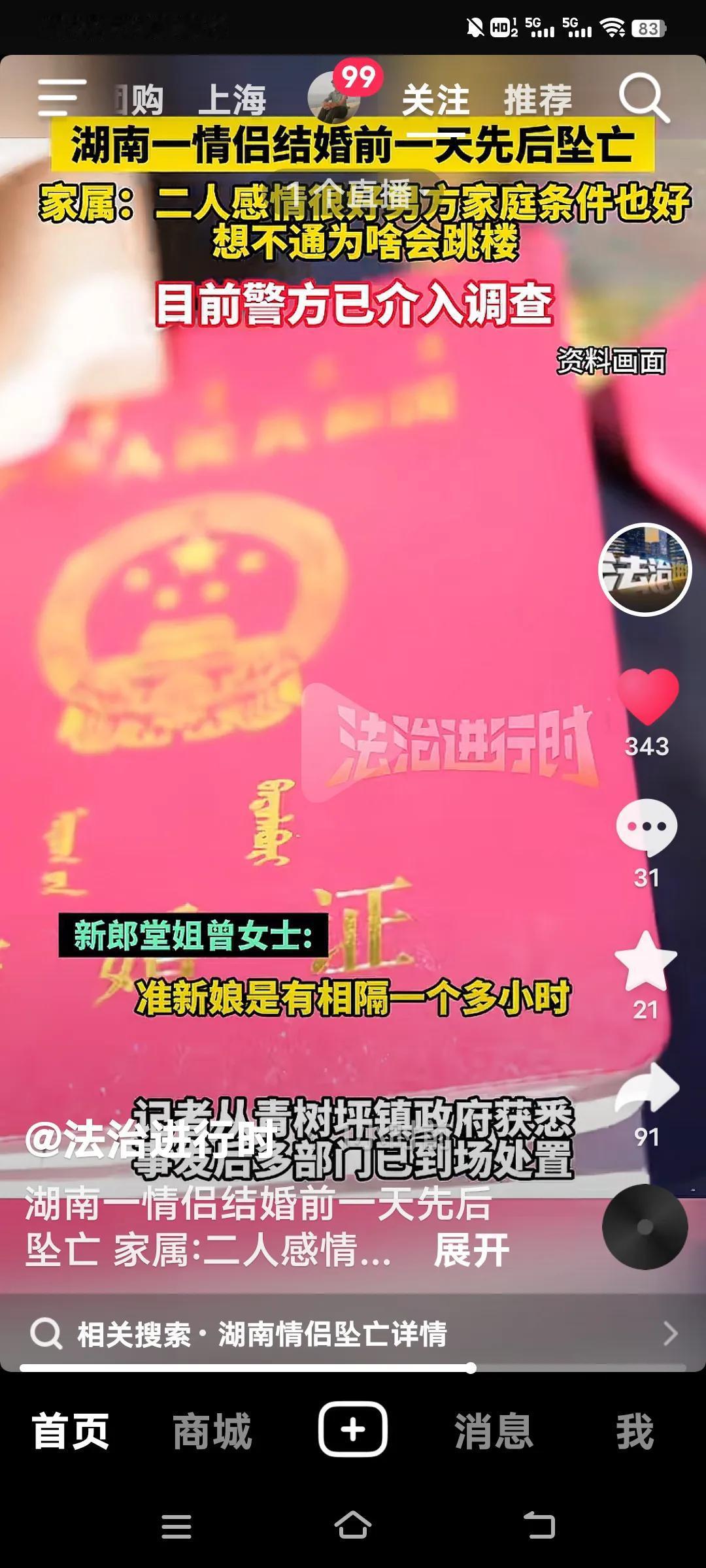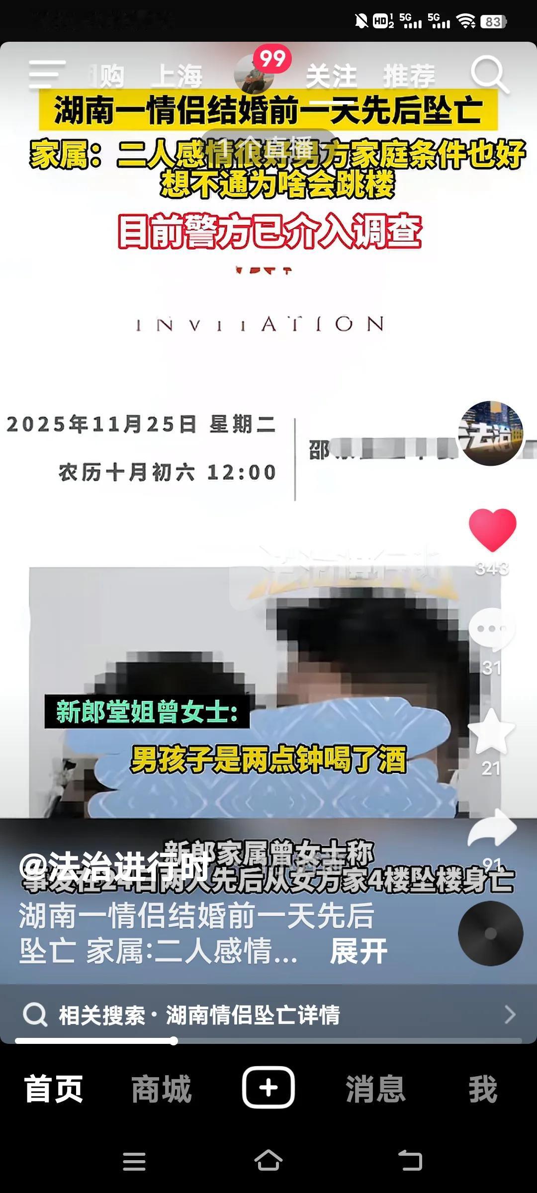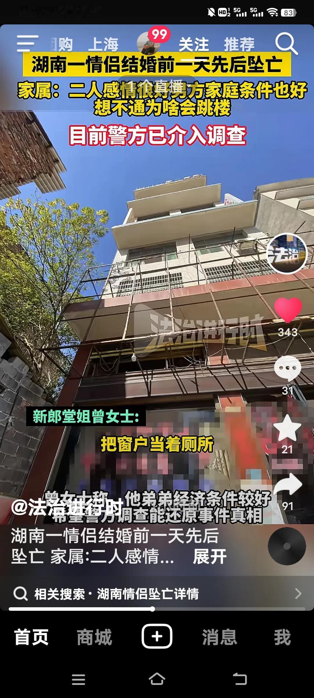 湖南这对恋人的悲剧太让人痛心。25岁的新郎和相恋五六年的女友,本定于11月25日结婚,却在24日凌晨两人结束了生命。警方调查排除刑事案件,新郎是意外坠楼,新娘目睹男友尸体后,相隔一个多小时也自主坠楼。新郎的堂姐曾女士说真是没有想到呀! 新郎堂姐说,23日晚两人聚餐后回女方家,初步查明是醉酒。新郎是喝醉酒了,误把窗户当厕所了从新娘家的4楼一脚下去就生命无归了,新娘随后也跳楼,下午抢救无效离世。他。新郎堂姐说他们两个人的感情甚好,也住在一起了。经济条件不错还没彩礼纠纷,希望警方调查能还原事件的真相。 不得不承认,新娘确实是个有情有义之人呀,让天天下人感动了。真想不到会是这样的结局一场欢乐的婚礼竟然变成了丧事。希望逝者安息,家属能慢慢走出悲痛。