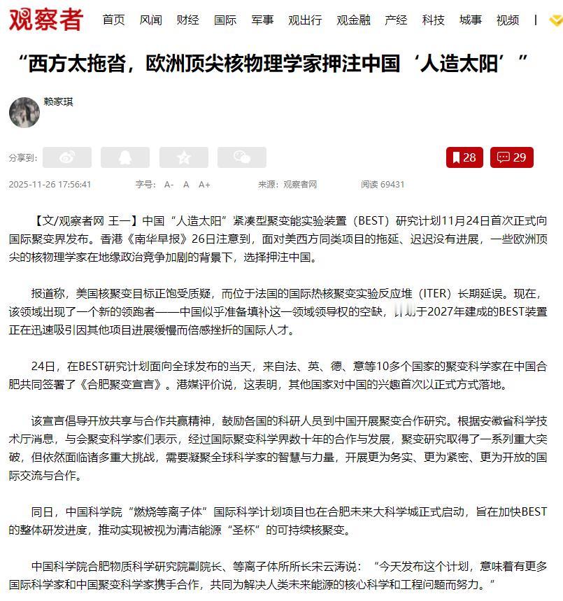 十几位欧洲顶尖科学家押注中国赢! 11月24日,当西方ITER项目把聚变实验拖到2039年、额外多花50亿欧元时,法、英、德等十国顶尖核物理学家直奔合肥,签下《合肥聚变宣言》押注中国BEST装置! 这个计划2027年建成的“人造太阳”,正以西方难及的效率,撕开全球能源竞赛的新战局,而这背后正是科研界对“实干”的集体选择。 中国能成为“终极能源竞赛”的核心靶点,关键不在于单纯“抢速度”,而在于深厚的技术积累、开放的科研生态,再加上西方项目的系统性滞后,优劣对比一目了然。 中国的底气源于数十年技术沉淀。BEST装置并非“急行军”,而是EAST“东方超环”的正统延续,这款“前辈”20多年完成15万次放电实验,今年初创下亿度千秒稳态运行世界纪录,吃透了稳态等离子体控制难题。 合肥科学岛已形成独特的“接力式研发”集群:EAST提供数据支撑,CRAFT铺垫关键技术,BEST专攻“燃烧等离子体”这一发电核心目标。 更难得的是,中国早深度参与ITER项目,曾攻克磁体冷却系统难题,如今已与50多个国家的120多家机构建立稳定合作,长期积累的信任比进度优势更具吸引力。 中国将“开放”落到了制度层面。11月同步启动的“燃烧等离子体”国际科学计划,绝非口号:全球科学家可申请开放基金,免费使用BEST等顶尖装置,还能参与联合实验与高频互访。 欧盟聚变能委员会主席直言这是全球合作典范,英国科学家也认可BEST“可行的物理设计”与高效落地环境。 这种“带着平台、机制谈合作”的模式,远比西方“先定规则再分资源”的拖沓流程,更能让科学家聚焦核心科研。 反观西方,聚变项目的拖沓是深植于治理的系统性问题。ITER作为七方合作项目,决策架构繁琐、责任分散,重大事项需多层把关,导致原计划2035年的聚变实验拖至2039年。 英国STEP项目号称引领聚变电站设计,却要到2040年代才有望运营,2025年才敲定研发资金。 美国SPARC虽喊着“低成本快进度”,至今仍停留在技术验证阶段。而中国已形成“实验装置-关键系统-发电演示”完整路线图,差距难以靠资本弥补。 科学家的选择,本质是对“有效科研”的追求。核聚变研究需要长期投入,中国既靠EAST与BEST的接力研发摸透核心技术,又用开放机制打破国界壁垒;西方却深陷流程内耗与“规划不落地”的怪圈。 这场竞逐从非零和博弈,而是人类清洁能源的共同探索。中国吸引全球人才的,不仅是“2027年建成、2030年演示发电”的明确时间表,更在于“实干+共享”的科研文化。 当西方仍在扯皮时,中国正带着50多国合作基础向关键阶段迈进。这种以制度优势践行“科学无国界”、以协作破解人类共同难题的模式,或许比率先实现聚变发电更具深远意义。