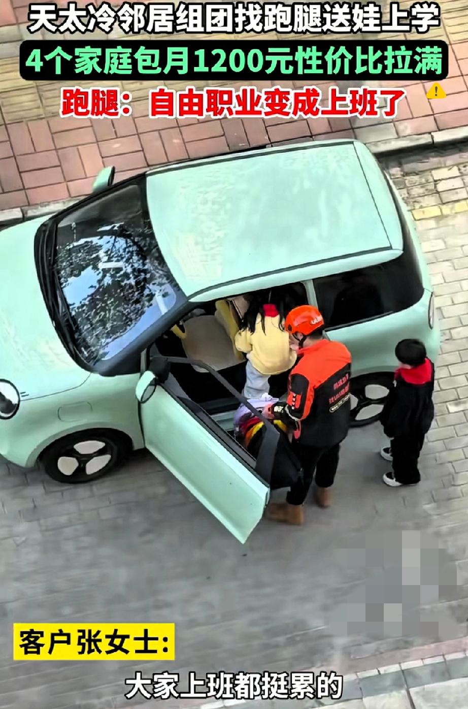 这波“拼跑腿送娃”也太会算账了! 自由职业直接变“朝九晚五” 天寒地冻的,谁愿意大清早爬起来送娃? 这4家邻居直接把“拼单”玩明白了—— 组团包跑腿送娃上学,4家平摊每月才1200块,算下来每家每天才10块钱,比自己冻得哆哆嗦嗦送靠谱多了! 最逗的是这跑腿小哥,本来干的是自由接单的活,这下直接成了“专职送娃司机”,每天定点接送跟上班似的,不过收入稳了也不亏。 其实这事儿根本不是“懒”,是现在年轻人上班本来就够赶的,花点小钱换个省心+睡懒觉的机会,性价比简直爆了。 这波操作也算是把“共享经济”用到生活骨子里了—— 既解决了自己的麻烦,也给跑腿小哥找了个稳定活,双赢啊! 你觉得这招靠谱不?要是你家附近有这好事,会不会跟着拼单?