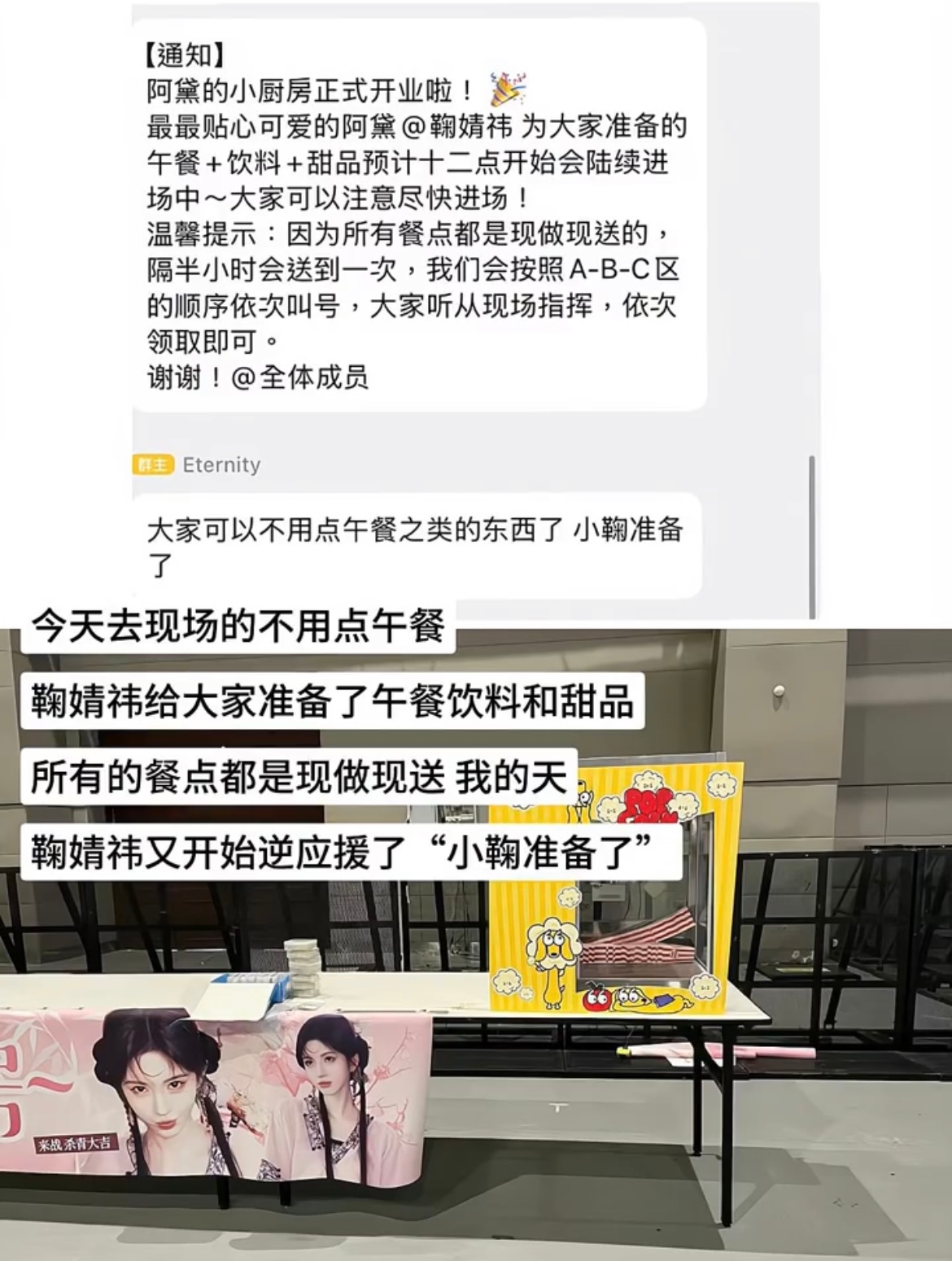 鞠婧祎给粉丝准备午餐饮料和甜品 鞠婧祎又逆应援太宠了给粉丝准备了午餐饮料和甜品,所有餐点都是现做现送!祝《来战》杀青快乐🎉阿黛一会见!鞠婧祎来战杀青了