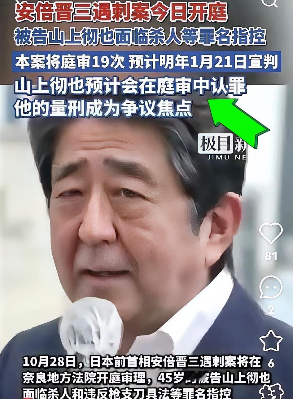还记得安倍吗? 今天开庭山上彻也认罪了 但刺杀安倍的山上彻也有救了 根据辩护律师的意见是他自己制造的枪械并不符合日本的枪支管制法规定,因此不构成开枪罪 法庭上的一幕令人屏息。山上彻也穿着深色运动服,头发束起,用几乎听不清的声音承认“一切属实,是我做的”。这个45岁的男人平静地承认了杀人行为,却意外点燃了一场法律界的风暴。辩护律师抛出的论点犹如一颗炸弹:那把自制枪支根本不符合《枪刀法》中“手枪”的定义。 这场审判已经超越了简单的认罪案件,变成了一场关于法律漏洞、社会悲剧与个人罪责的激烈博弈。奈良地方法院为本案安排了19次庭审,要等到明年1月21日才会宣判。32个旁听席位吸引了近千人排队抽签,有人特意请假从各地赶来,就想亲眼见证这场牵动整个日本的审判。 山上彻也的人生轨迹充满坎坷。母亲沉迷“统一教会”后家庭破产,1亿日元的巨额捐款吞噬了这个家的希望。父亲早逝、哥哥自杀,他被迫放弃升学梦想。在法庭上,他坦言母亲1991年入教后,自己的“人生观和思维方式都发生了根本性转变”。那些绝望与危机感,最终驱使他将矛头指向了与前首相岸信介有渊源、曾为教会发送视频寄语的安倍晋三。 检方态度强硬如山。他们承认山上童年的不幸,却坚决主张“生平经历不应对刑罚产生重大影响”。光天化日之下前首相被枪杀,这是“日本战后史上从未有过的严重事件”。检方还揭露山上曾在案发前一日前往冈山县企图袭击,失败后转而选择在奈良行凶。 更令人揪心的是山上母亲的态度。她在庭审前夕接受采访时坦言:“如果不是我,他不会走到这一步。”然而她同时表示,枪击事件后自己对“统一教”的信仰反而更加坚定了。 这场审判犹如一面镜子,照出了日本社会深层的伤疤。宗教与政治的暧昧关系、家庭崩坏带来的连锁反应、法律条文与现实罪责的差距,都在这个法庭上激烈碰撞。就连安倍昭惠也将通过“被害者参与制度”在法庭表达意见,让这场审判的情感维度更加复杂。 法律专家分析,山上彻也很可能面临无期徒刑。日本虽然保留死刑,但通常只在嫌疑人杀害多人时才会适用。这场审判的最终结局,将取决于法官与陪审团如何权衡冷冰冰的法律条文与背后滚烫的人生悲剧。 各位读者你们怎么看?欢迎在评论区讨论。 山上彻也