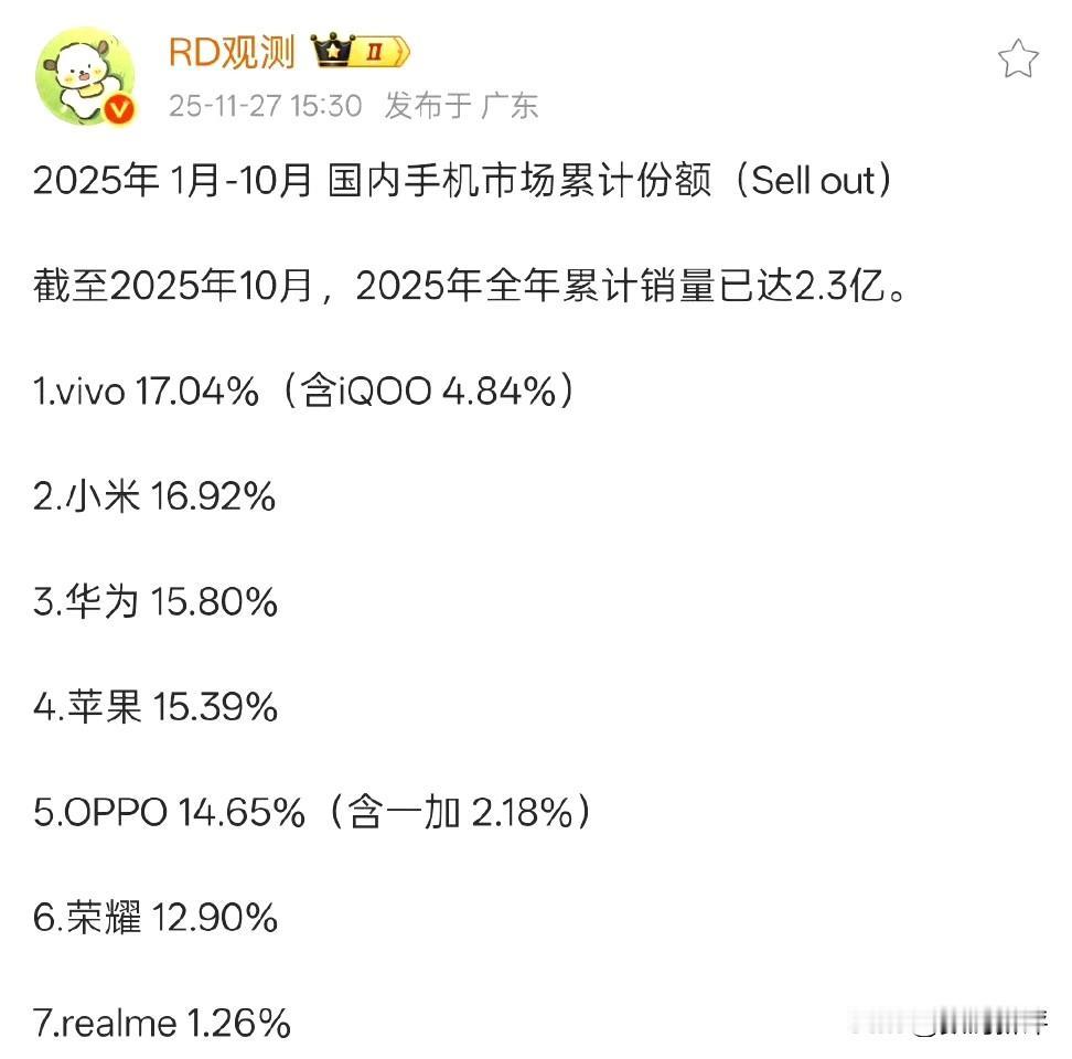 前10个月累计份额vivo第一[灵光一闪]比小米多0.12%,还是特别接近的,下个月vivo有S50系列,小米可能有小米17Ultra[思考]还能再冲一冲,华为也有希望第一,就看mate80系列表现了,苹果的话第一感觉希望不大但是争取前三还是没问题的,如果后续iPhone17系列还是这么强势,没准第一[笑哭]