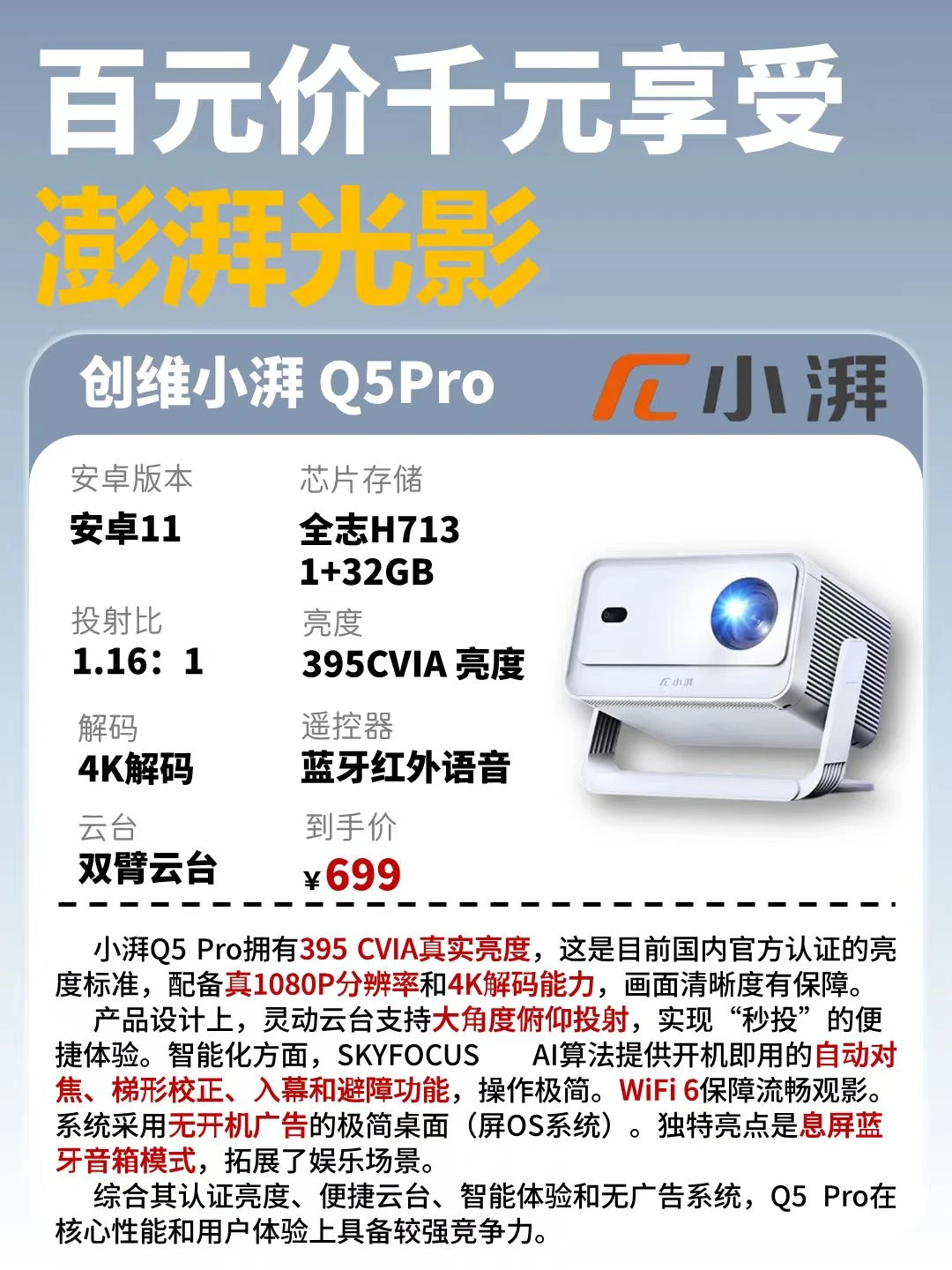 它的高认证亮度保证了更好的观影基础,更新的安卓11系统和4K解码能力更面向未来,灵活的双臂云台和全套智能校正让使用无比省心,加上无广告的清爽体验和独特的蓝牙音箱模式,确实是700元档位里把“核心体验”卷明白了的选手!追求性价比又不想妥协太多?创维小湃Q5Pro值得放进你的购物车🛒!