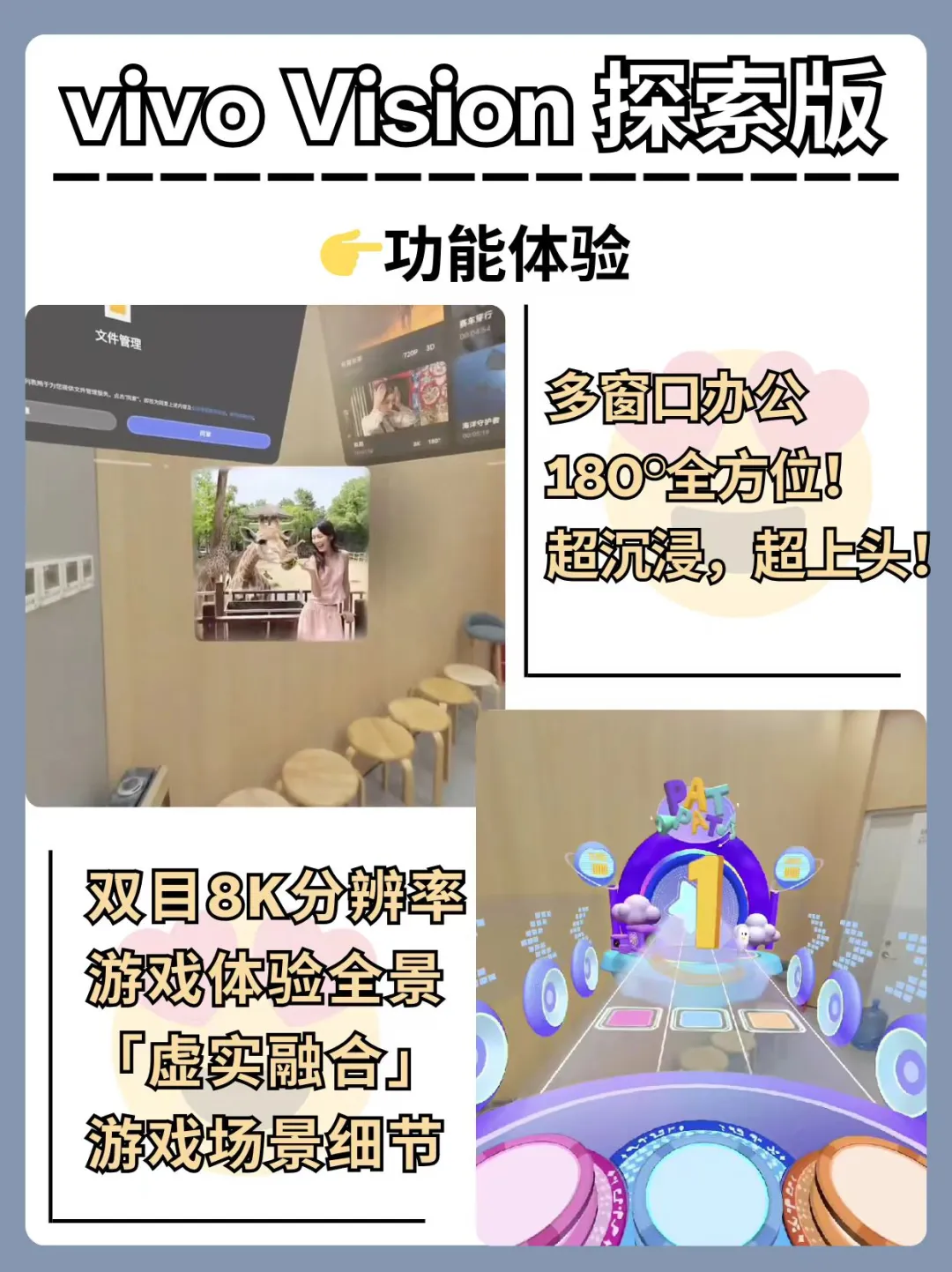 ✅交互体验精心打磨这次 vivo Vision 探索版把 MR头显交互做得非常出色,使用感受令人印象深刻。空间记录支持 3D 立体回看,空间照片/空间视频可自由调整视角,全景细节分毫毕现