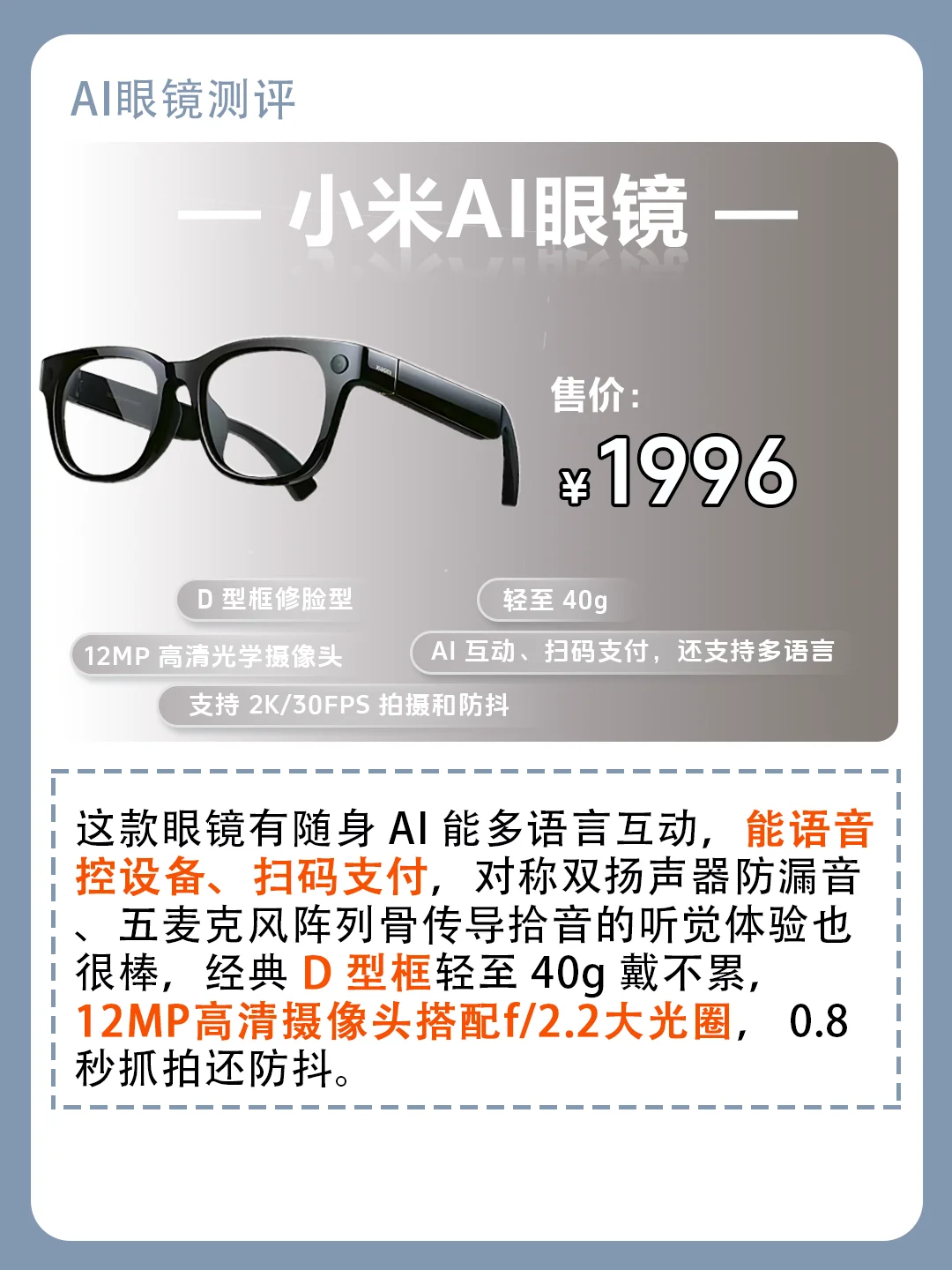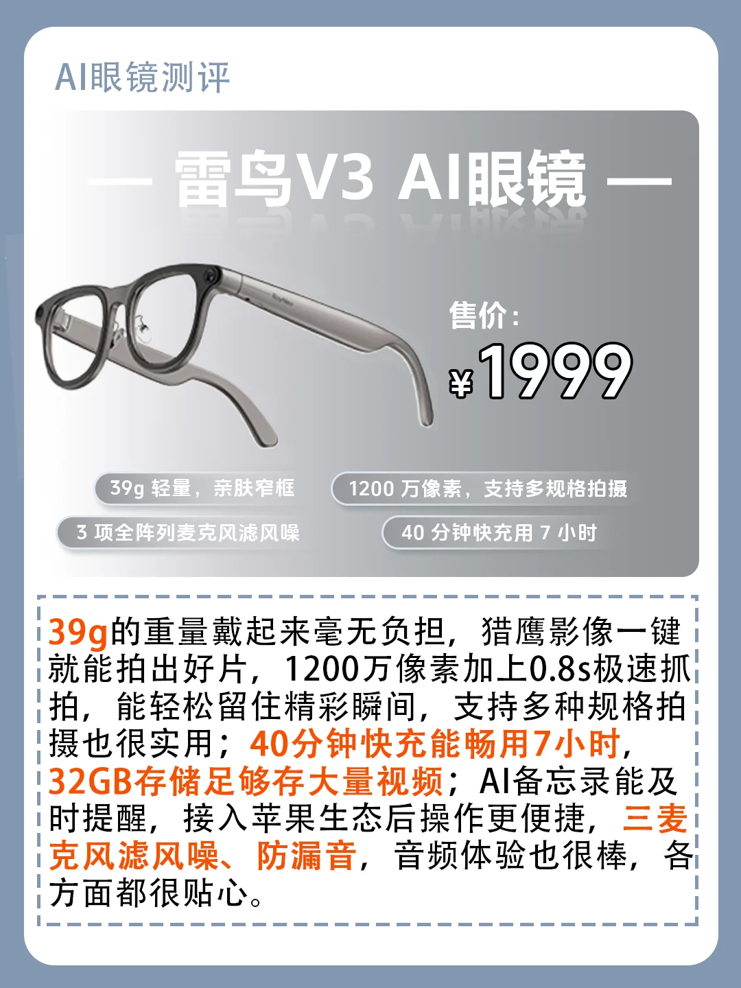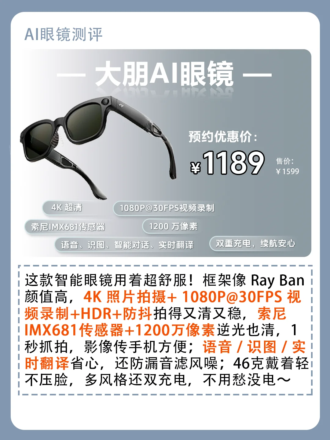 [斜眼R]宝子们,七七在研究 AI 眼镜,发现大朋、小米、雷鸟这三款都很可,各有各的好,来跟你们唠唠~ 🙌选 AI 眼镜,我觉得主要看这几点:首先是拍摄,画质清晰、防抖好才方便记录;然后是操作,语音、识图这些智能功能用着得顺手;还有重量,戴久了不能累;续航也得跟上,别老担心没电。 综合看这三款都挺可的: 小米AI眼镜 👓 D型框特修脸型🥰,1200 万高清摄像头,支持 2K/30FPS 拍摄还防抖,0.8 秒就能抓拍,记录生活超合适,AI 能多语言交流、控设备还能扫码支付,出门超方便! 雷鸟V3 AI眼镜 👓 贼轻!才39g🤩,亲肤窄框,戴一天都没负担~拍照很绝,1200 万像素 + 0.8 秒抓拍,精彩瞬间轻松留住~充电快,40 分钟快充能用7 小时,还有充电盒,能续30小时,适配苹果生态,AI 备忘录还能及时提醒,三麦克风滤风噪、防漏音,音频体验也很棒 大朋AI眼镜 🕶️ 它也太懂需求了吧!✨设计感十足,戴出门颜值超可😎,拍摄更是绝绝子!4K 照片+1080P视频,还带HDR和防抖,搭配索尼IMX681传感器+1200万像素,逆光拍都清晰,画面又稳又清楚🥳,操作超方便,语音、识图、实时翻译全拿捏,还能边拍边充,放眼镜盒自动补电,完全不担心没电~ ❗️关键是,现在🤲发优惠补后到手才1189元起🔥,性价比真的没话说~ 🌟要是想兼顾颜值、画质和预算的,大朋这款真心可以冲; 🌟喜欢显脸小、需要多语言互动的,选小米就很合适; 🌟想戴得超轻、又适配苹果生态的,雷鸟值得试试~