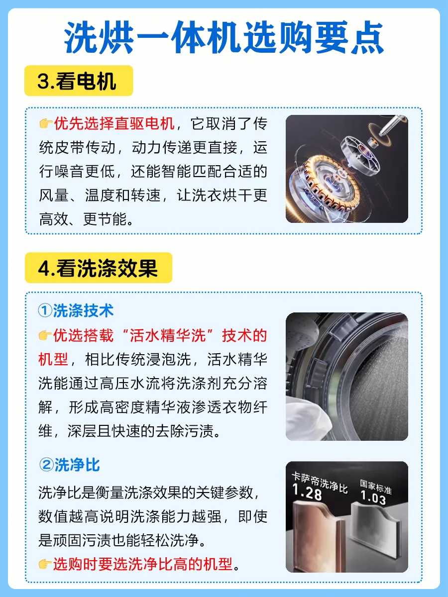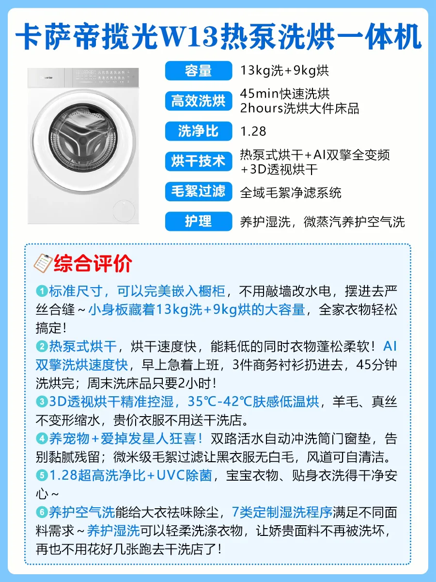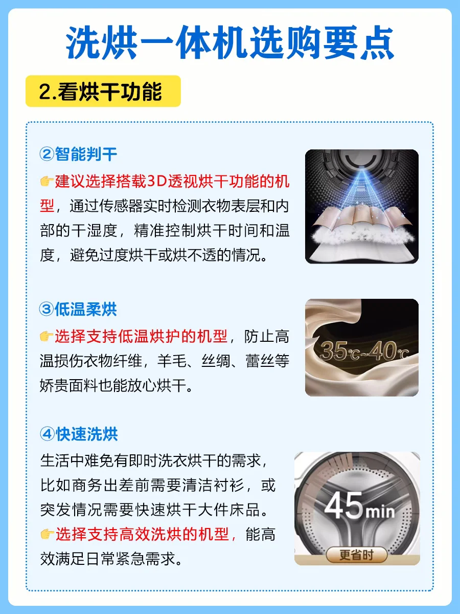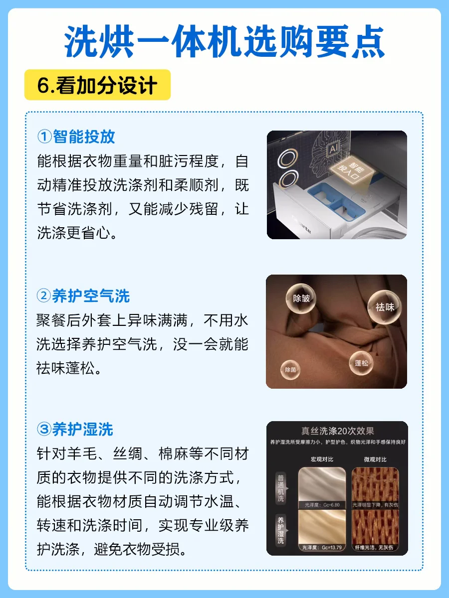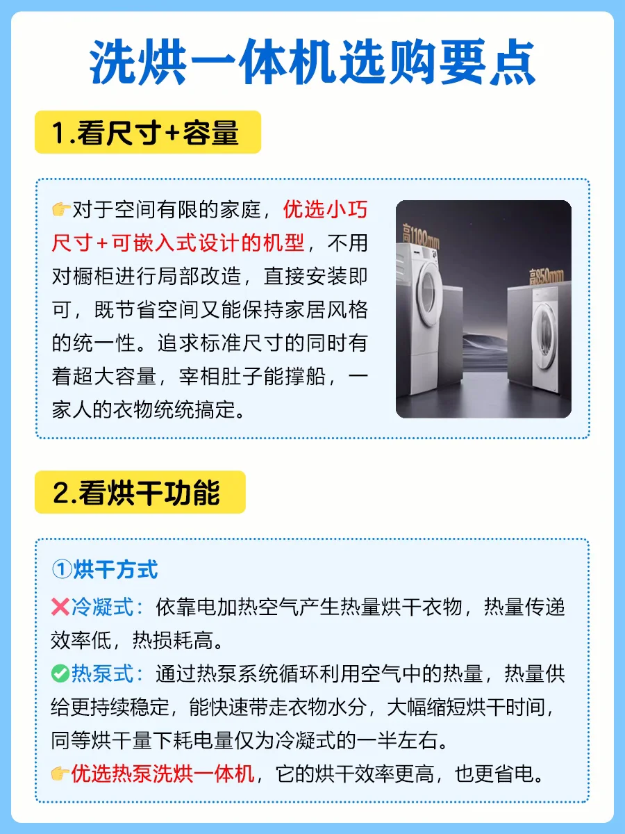 🤔经常有人问我洗烘一体和洗烘套装该如何选!我的回答是:✅如果你家是小户型✅橱柜不想大改造✅又想满足洗烘护一系列需求,👉🏻那么,一台全面的洗烘一体机才是满分💯答案~ 📝洗烘一体机选购要点 1️⃣看容量+尺寸 2️⃣看烘干功能 3️⃣看电机 4️⃣看洗涤效果 5️⃣看自清洁功能 6️⃣看加分设计 ✨给大家盘点了市面上热门的3款洗烘一体机,详细攻略请看图片~