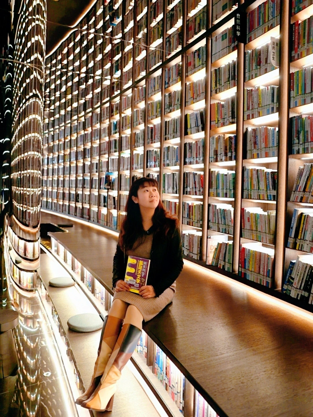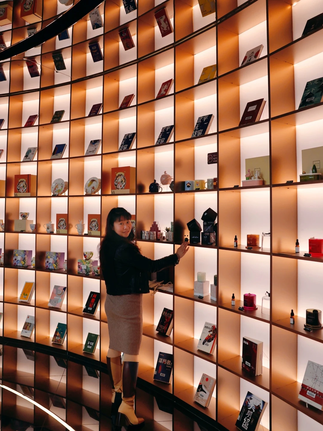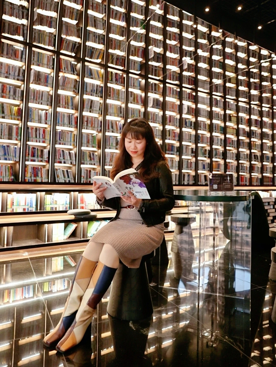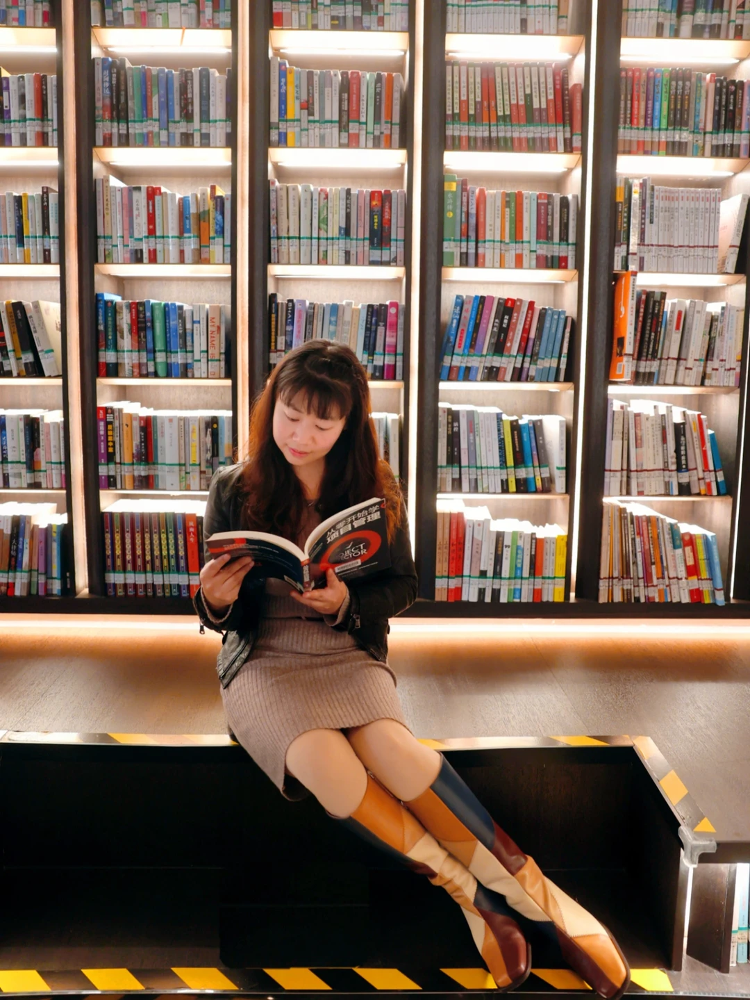 今年的冬天似乎特别的长,阴雨不断,人也提不起精神。 于是找了一个下午来到种草已久,由海珠区图书馆和侨建 HI CITY 合作共建的御溪书斋。 一走进书斋,通透的镜面与灯光相配合,让本身不大的书斋开阔了许多,更无限拉长了书柜的纵深度,再加上星光般的灯饰,如满天繁星坠入银河! 这里也忍不住想分享一个阴雨天的小穿搭心得,纯色针织裙搭配黑色小皮衣不免有些单调。新入手的西班牙小众品牌 Alohas拼色长靴,多了几分色彩,也不失高级感!