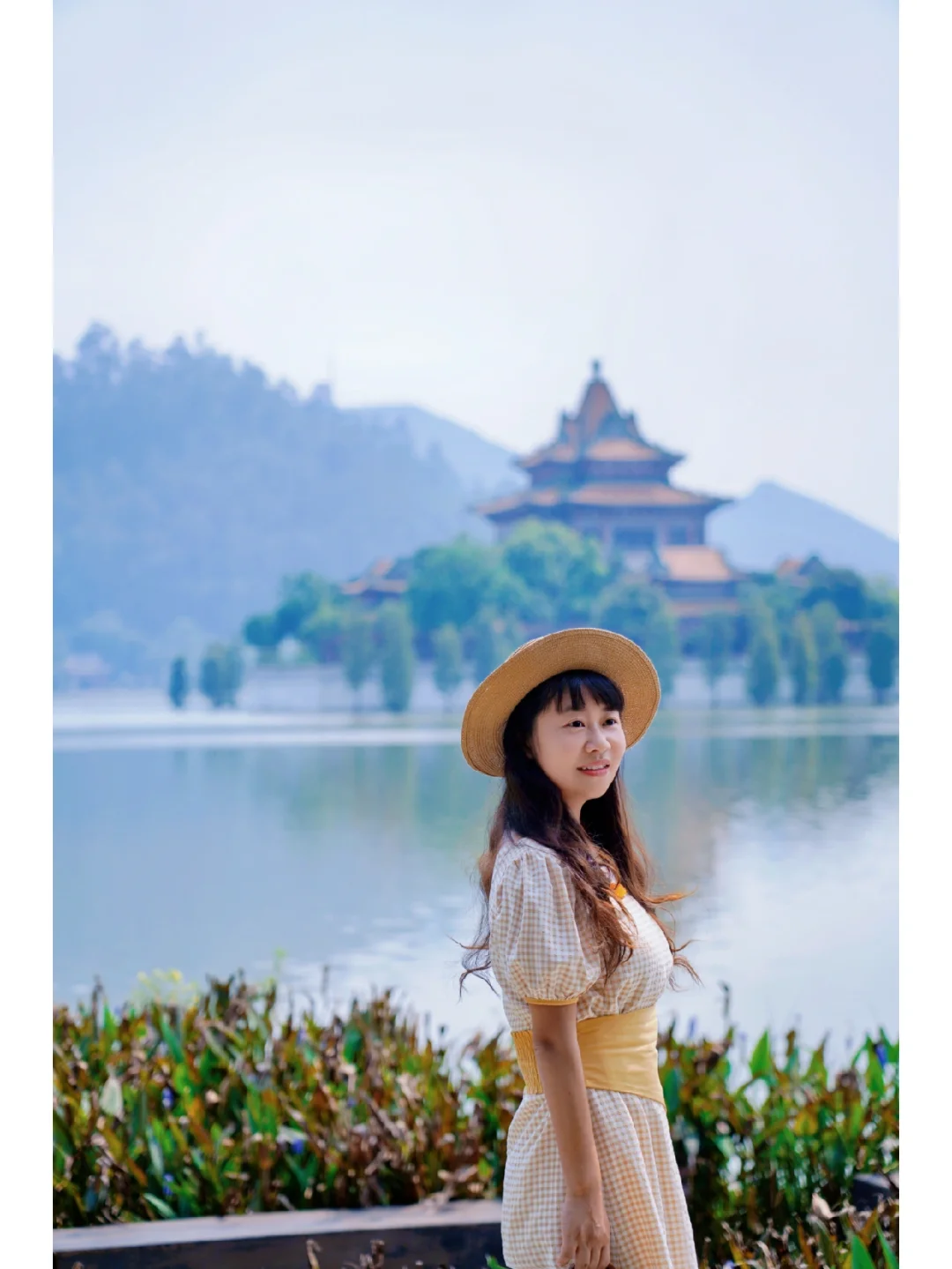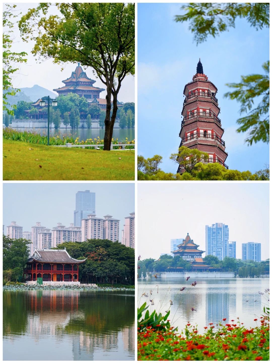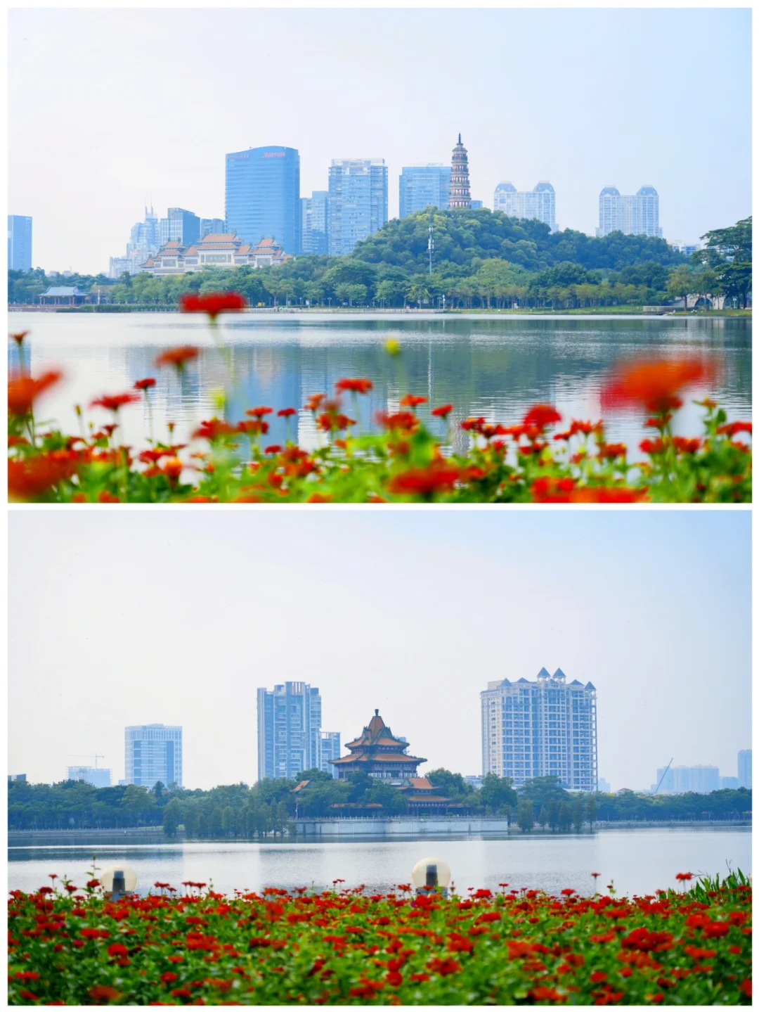 从花这边拍湖对岸的古塔、楼阁也很有感觉!