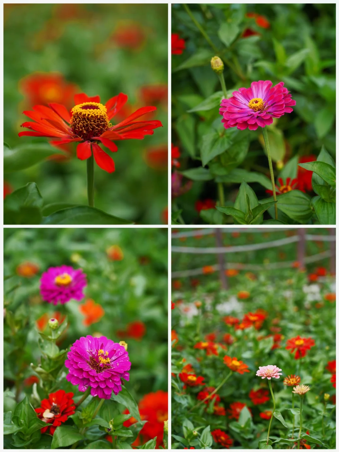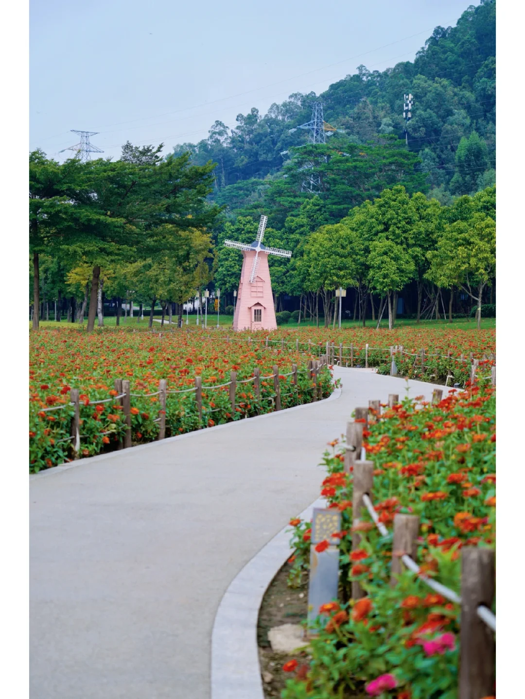 百日菊花每块花田都有花间小路,拍照非常友好,很容易拍出人在花海中。粉色的风车也就自然而然的成为了最佳背景!