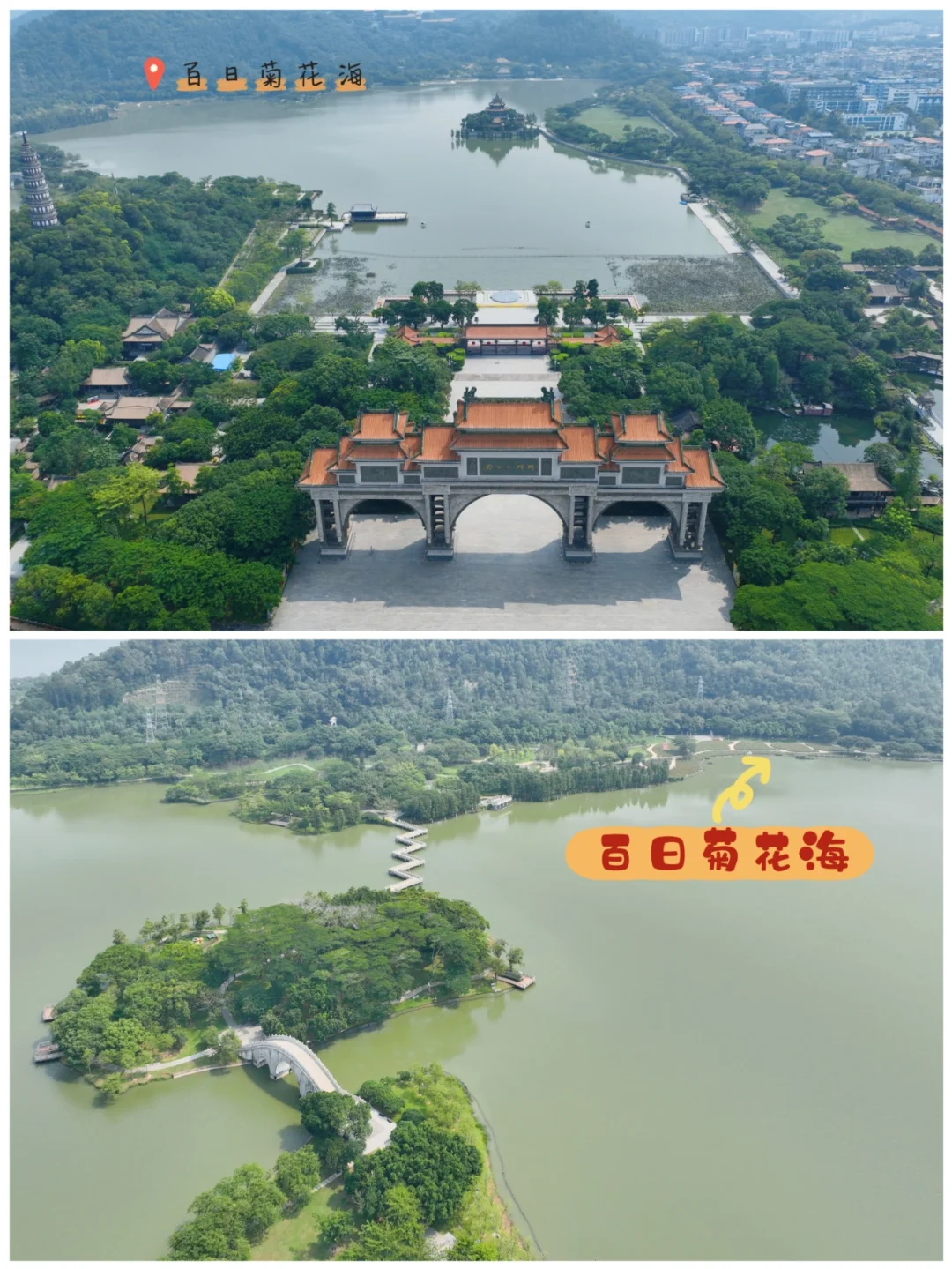 🚶 🚶 从北门进入,穿过“中华第一牌坊”,沿湖过桥来到湖对面,就到了百日菊花海。