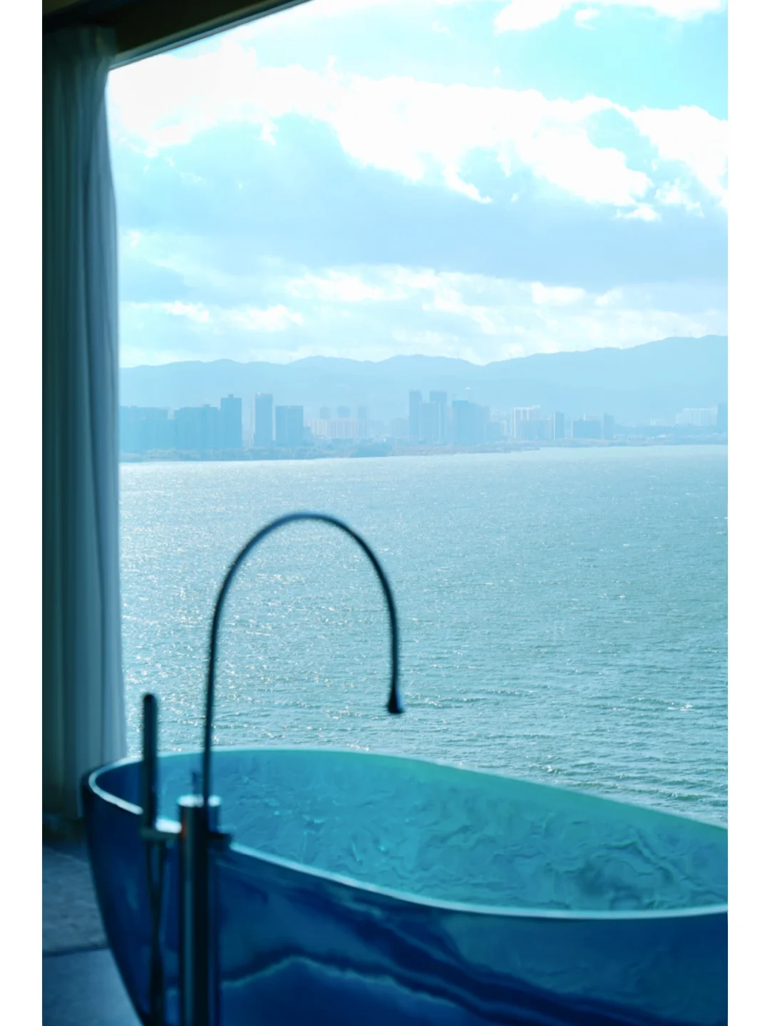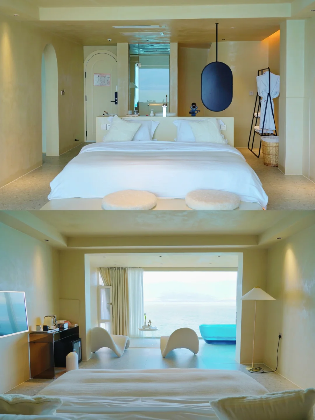 180度视野的海景房,室内整体采用 ins 奶油风,白色的家具和软装为主调,蓝色透明泡池与落地窗外海天一色的蓝相互映衬,纯净而治愈