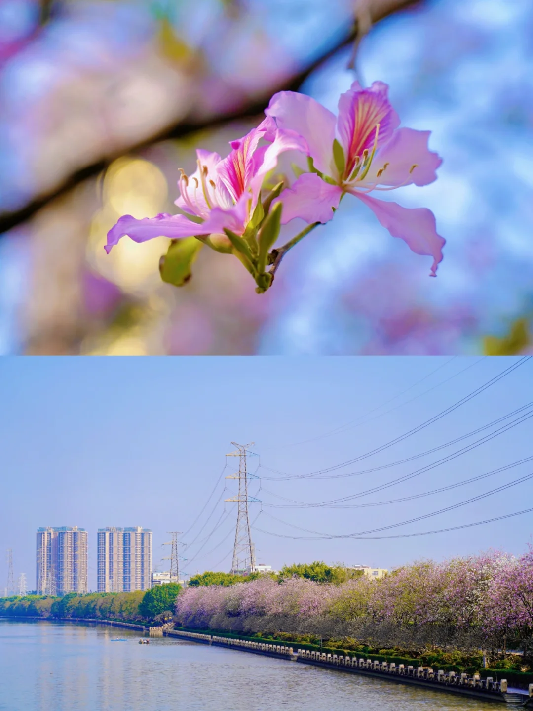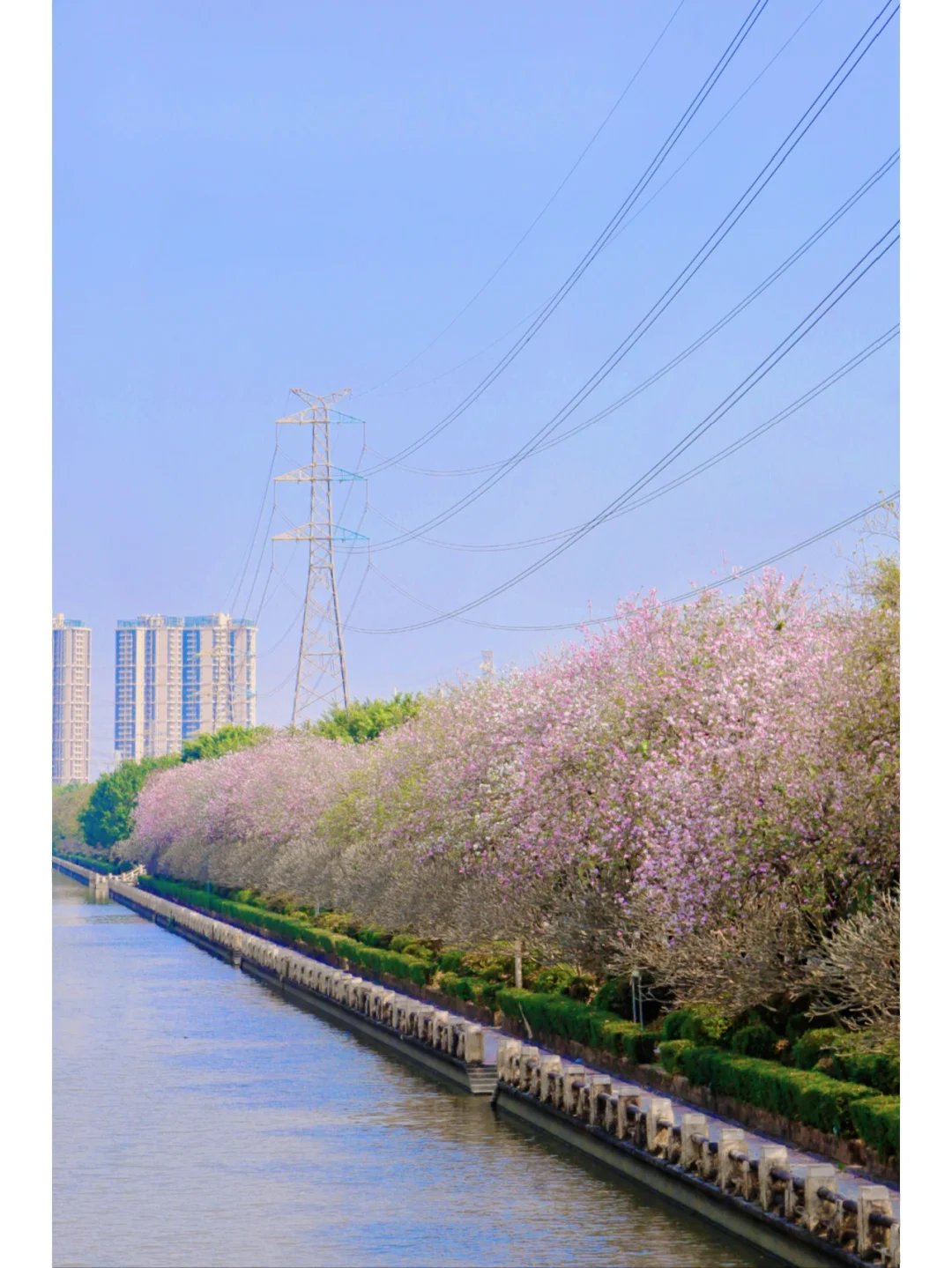 一排宫粉紫荆沿河道蜿蜒