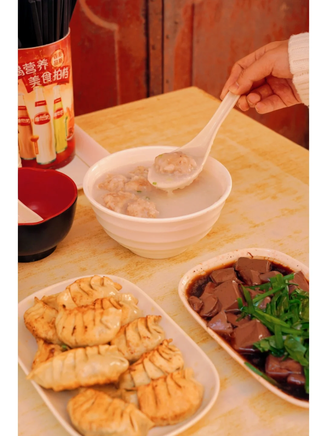 浩辉饮食店:招牌肉丸洲、煎饺、猪红韭菜,都还不错