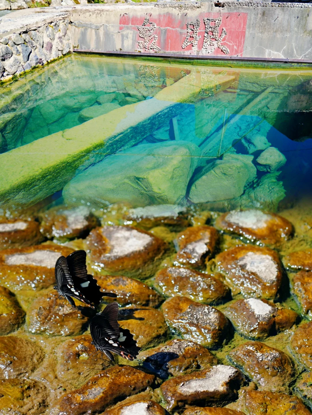 泉水清澈,如一块绿色的翡翠,若有若无的热气在阳光下蒸腾。几只黑色的蝴蝶在一旁翩翩起舞。