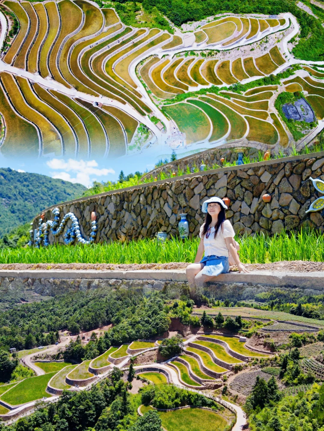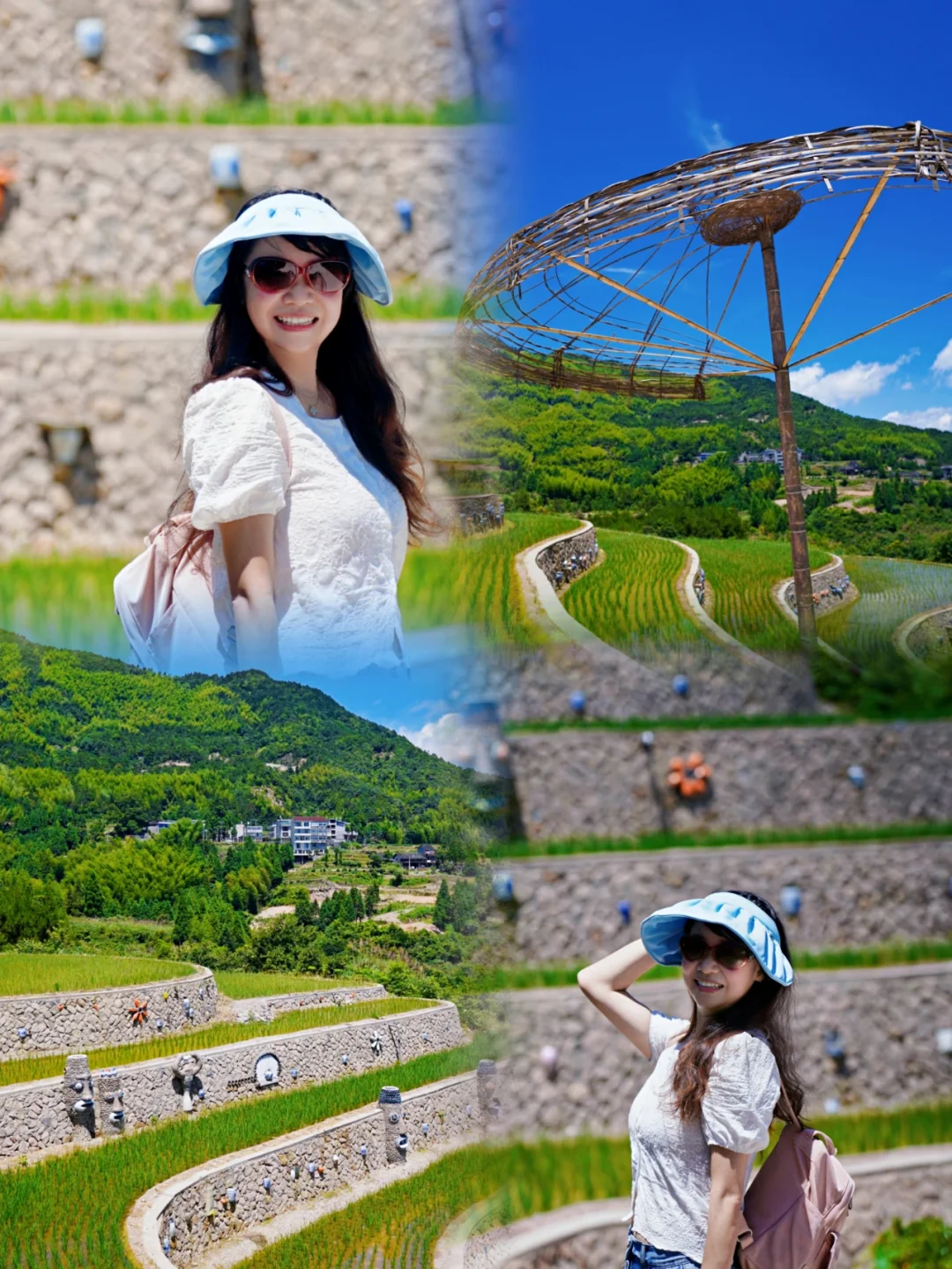 这个以山海经为主题的美丽田园,错落有致的梯田边有着各式的雕塑磁艺,手工编织的凉亭独具地方特色。