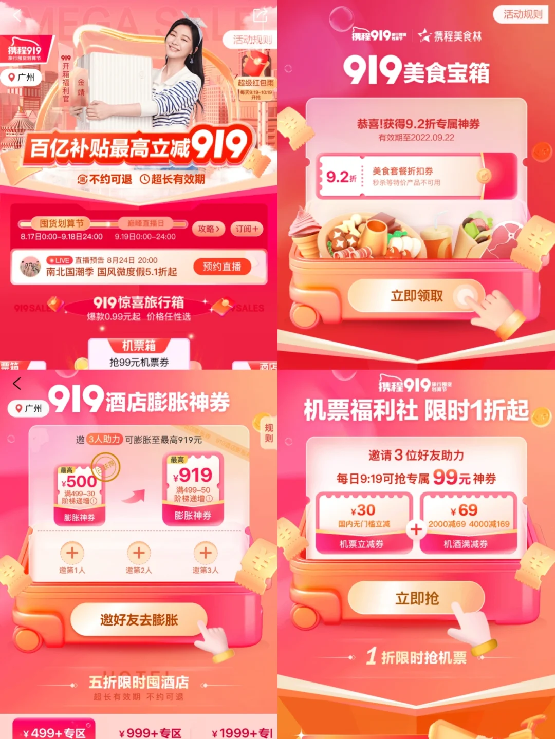 对了,最近🐬上919活动挺给力哦,机票、酒店、餐饮都有[红包R][红包R][红包R],要是邀请3个好友助力还能拿到919💰 的券呢~ 越贵的酒店越划算哦!