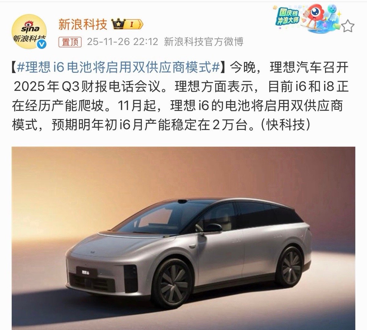 理想i6电池将启用双供应商模式理想i6采用宁德时代与欣旺达双电池供应商模式,既分散了单一供应商的产能依赖风险,也为理想与欣旺达的合资电池业务铺路,契合新势力供应链自主化的趋势。这其实是个好消息啊,双供也不是啥品质降级,性能参数与质保政策的统一就行,对咱们消费者而言,还能快点提车,我觉得理性看待比盲目纠结更重要~