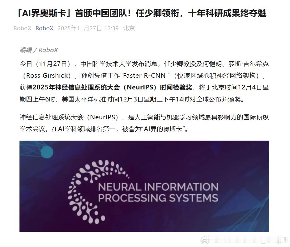 中国科学技术大学讲席教授、蔚来汽车副总裁任少卿和团队成员何恺明、Ross Girshick、孙剑一起,凭借“Faster R-CNN ”(快速区域卷积神经网络架构),获得2025年神经信息处理系统大会(NeurIPS)时间检验奖。神经信息处理系统大会(NeurIPS),是人工智能与机器学习领域最具影响力的国际顶级学术会议,在AI学科领域排名第一,被誉为“AI界的奥斯卡”。NeurIPS时间检验奖,是全球人工智能领域含金量最高的奖项之一,旨在表彰十年前发表于 NeurIPS、并在此后显著影响研究领域、经受住时间考验的优秀论文。今年的获奖成果是2015年由中国学者任少卿,何恺明,孙剑主导,联合美国人工智能科学家 Ross Girshick 共同发表,其提出的新型网络架构,将物体检测效率提升10倍以上,首次开创了端到端实时精准目标检测的全新范式。该工作学术引用超9.8万次,文章第一作者任少卿,现任中国科学技术大学讲席教授、蔚来汽车副总裁,该工作是在其攻读博士期间(中国科大-微软亚洲研究院联合培养博士)完成,是华人作为第一作者在该会议上发表的学术引用量最高的文章;是AI检测领域全球最高被引论文。这个奖项的份量有多重?- Geoffrey Hinton(2022年NuerIPS时间检验奖,2024年诺贝尔物理学奖、 2018年图灵奖);- Yoshua Bengio(2024年NuerIPS时间检验奖,2018年图灵奖);- Ilya Sutskever(2022,2023,2024年NuerIPS时间检验奖,OpenAI联合创始人、首席科学家);- Jeffrey Dean(2023年NuerIPS时间检验奖,Google Brain 联合创始人);- Ian Goodfellow(2024年NuerIPS时间检验奖,Google DeepMind、Google Brain 杰出科学家,机器学习奠基之作、AI圣经《深度学习Deep Learning》作者);- Oriol Vinyals(2024年NuerIPS时间检验奖,Google DeepMind杰出科学家,AlphaFold共同作者);- Greg Corrado(2023年NuerIPS时间检验奖,Google AI 首席杰出科学家)。蔚来汽车新能源汽车人工智能大V聊车